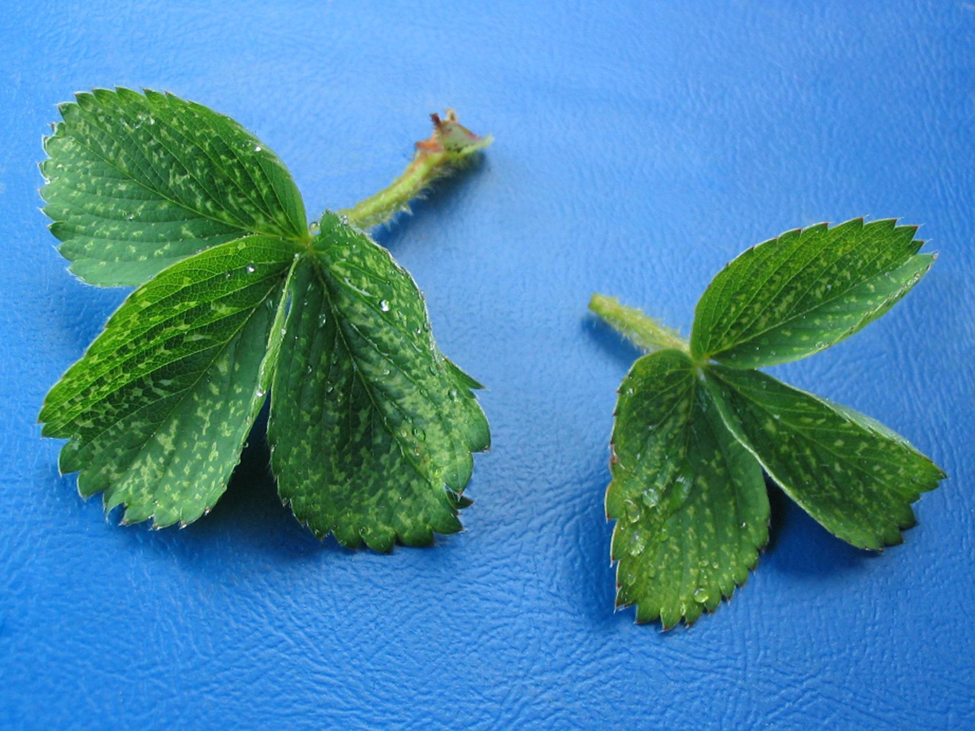 Description: Sur de jeunes plants nouvellement transplantés au champ, les feuilles montrent de taches angulaires blanches distribuées de manière régulière entre les nervures. Les taches sont petites (1 à 2 mm de diamètre) et translucides lorsque la feuille est placée à contre-jour ou devant le soleil. Les cellules contiennent peu ou pas de chlorophylle. Des conditions climatiques néfastes pourraient être impliquées. Une température froide combinée à une forte intensité lumineuse pourrait causer de tels dommages.