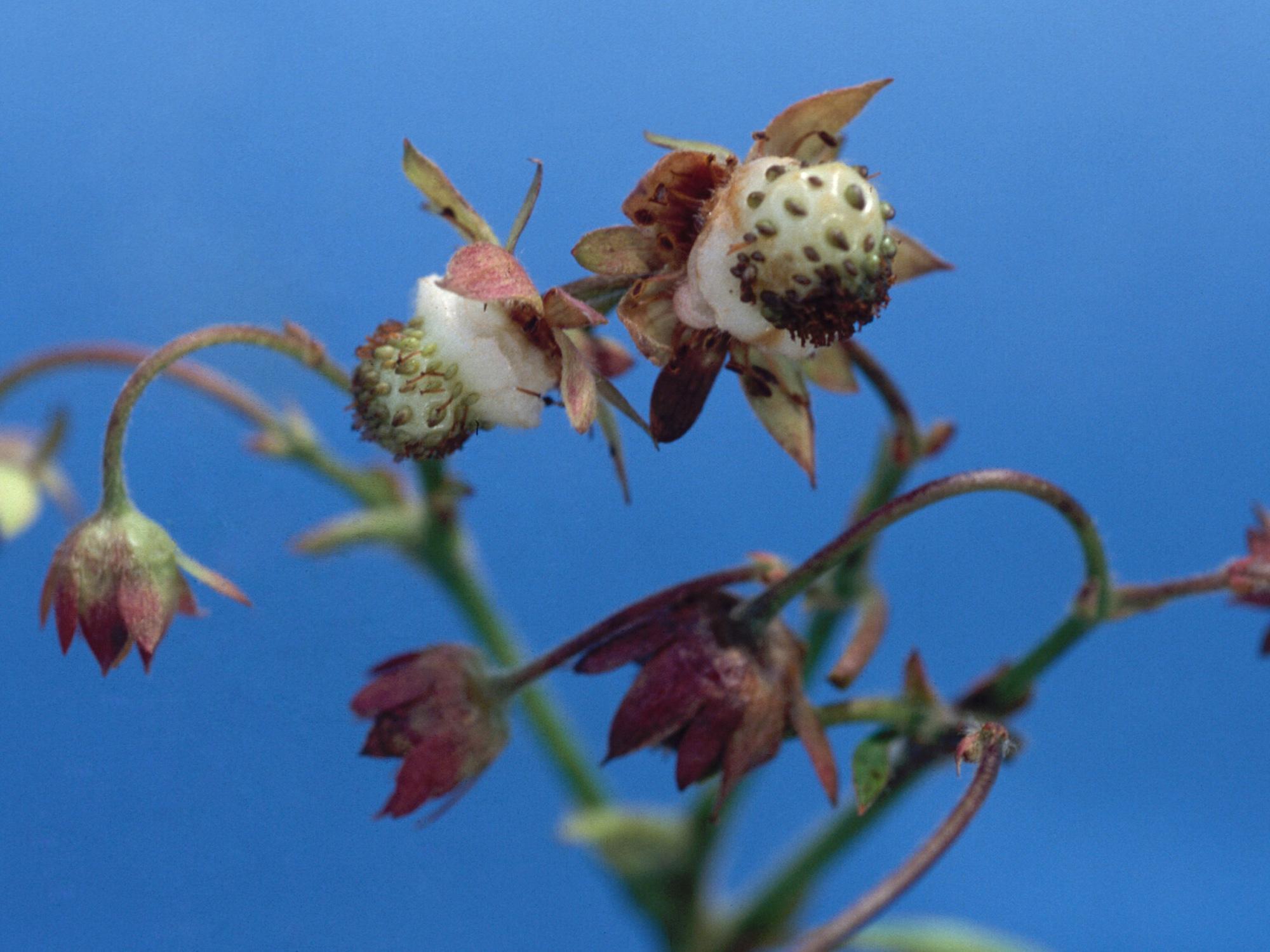 Description: Les fraises sont déformées et les akènes sont regroupés dans la partie distale du fruit. Les symptômes s’apparentent à ceux d'une carence de bore. La carence en bore réduit la taille de la fleur et la production de pollen, causant des fruits difformes, petits et d’une mauvaise qualité.