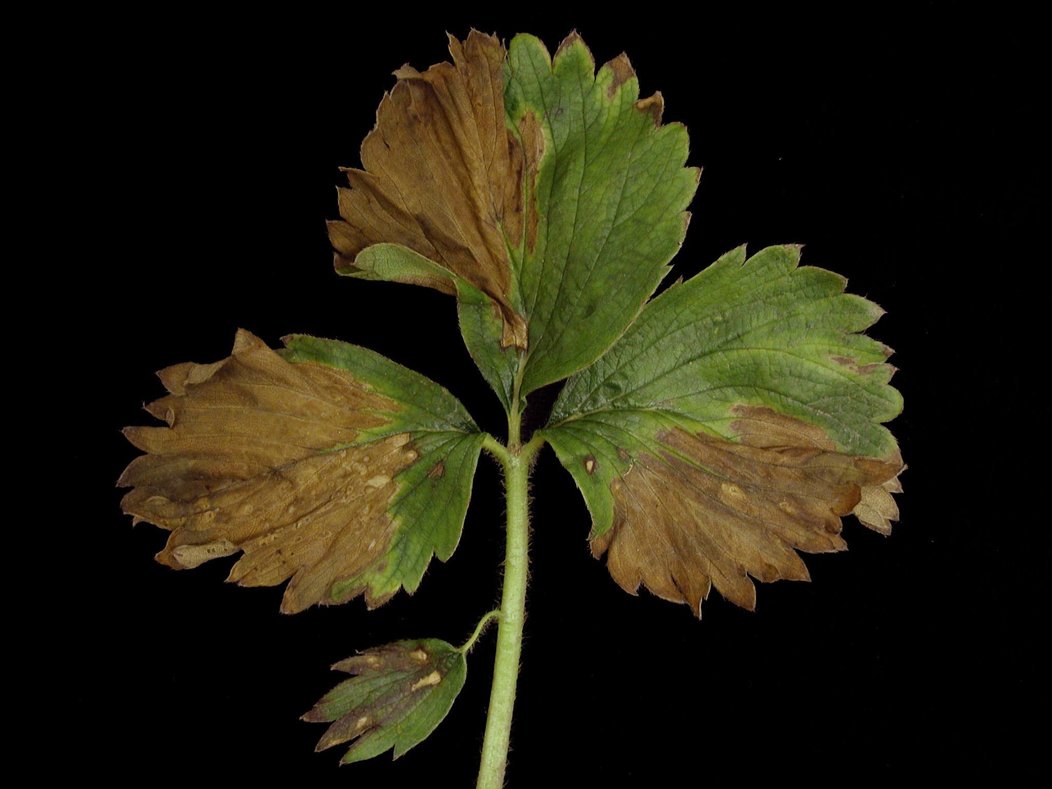 Description: La feuille de fraisier présente des brûlures brunes, d'une apparence sèche débutant à la marge ou près de l'apex et progressant par la suite entre les nervures. Une légère bordure jaune se situe à la base de la brûlure. Les brûlures couvrent en moyenne 25 à 30 % de la surface du limbe. La moelle des collets est entièrement brune, le système vasculaire est blanc et les racines sont blanches (non visible ici). Les tests de laboratoire se sont avérés négatifs pour la détection des champignons. La coloration brune de la moelle est un symptôme caractéristique d'un dommage par des conditions hivernales adverses. Il est plausible de croire que les brûlures foliaires soient une conséquence indirecte des dommages au collet par le gel hivernal.