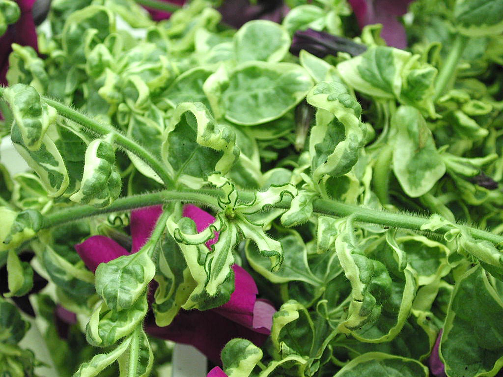 Description: Toutes les feuilles de pétunia (cv 'Limelight') provenant d’une serre présentent d’importantes malformations qui se caractérisent par un enroulement de la marge vers la face supérieure et un gaufrage du limbe. Quelques feuilles sont complètement blanches. Tous les autres organes sont sans symptôme. Les tests de laboratoire se sont avérés négatifs pour la détection de virus (test sérologique ELISA et microscopie électronique).