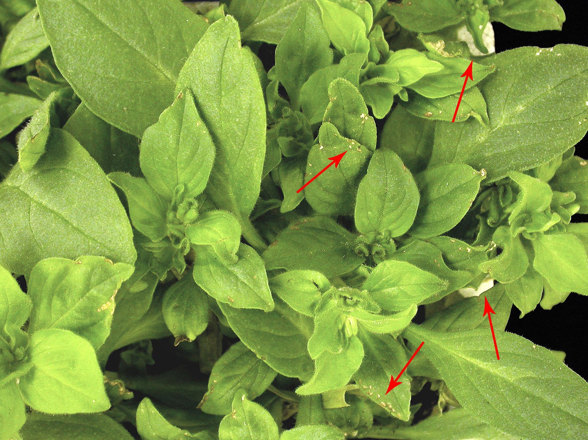 Description: Les feuilles médianes des plants de pétunias montrent des taches nécrotiques blanches à beiges localisées à la marge et à l’apex (voir flèches). Ces feuilles sont légèrement déformées. De fines taches sont également visibles à la loupe binoculaire et elles ne traversent pas le limbe (pas visible ici). Les tests de laboratoire se sont avérés négatifs pour la détection de virus.