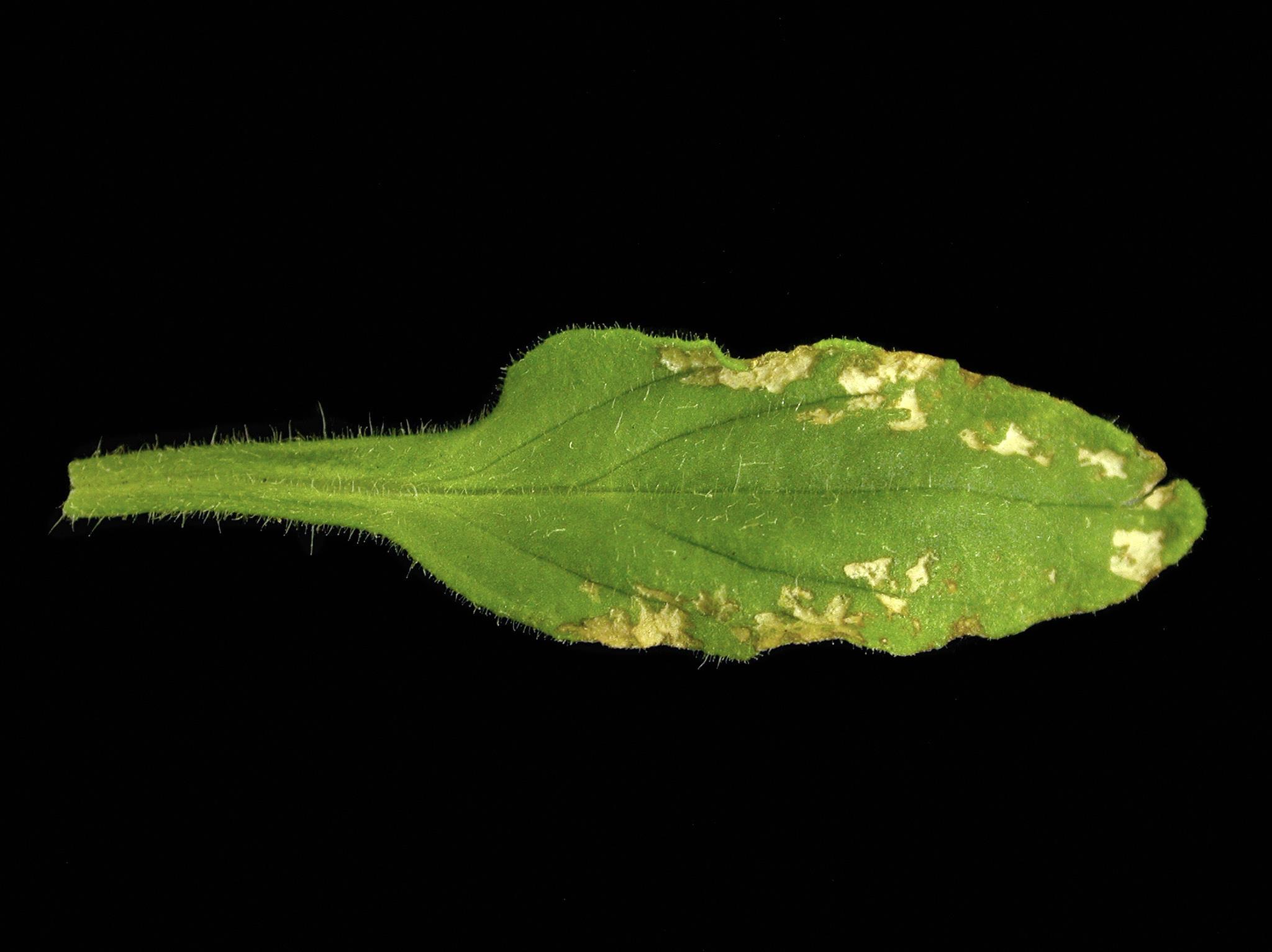 Légende: Taches et brûlures blanches sur feuille de pétunia