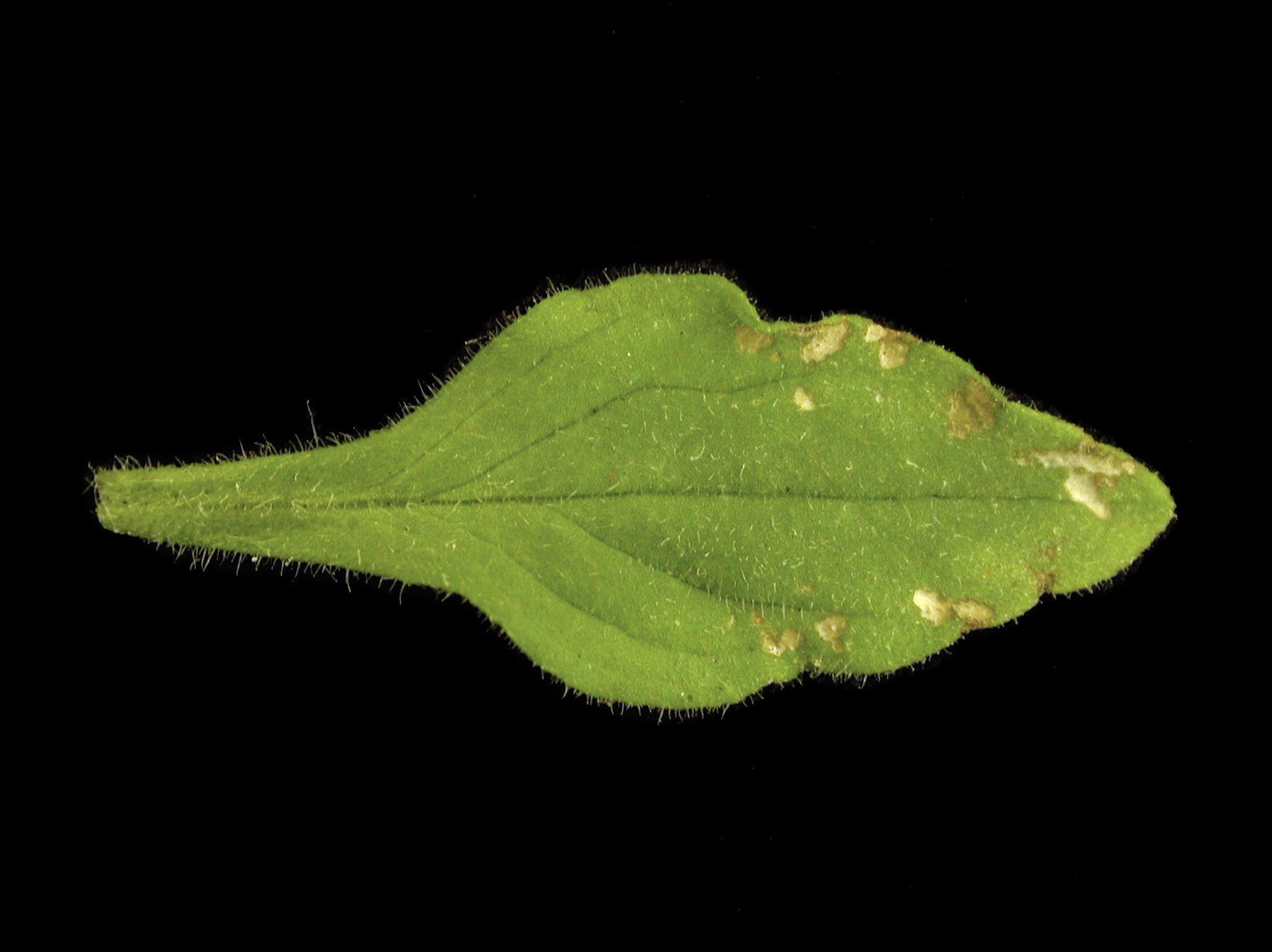 Description: Une feuille médiane de pétunia montre des taches nécrotiques blanches à beiges localisées à la marge et à l’apex. Ces feuilles sont légèrement déformées. De fines taches sont également visibles à la loupe binoculaire et elles ne traversent pas le limbe (pas visible ici). Les tests de laboratoire se sont avérés négatifs pour la détection de virus.
