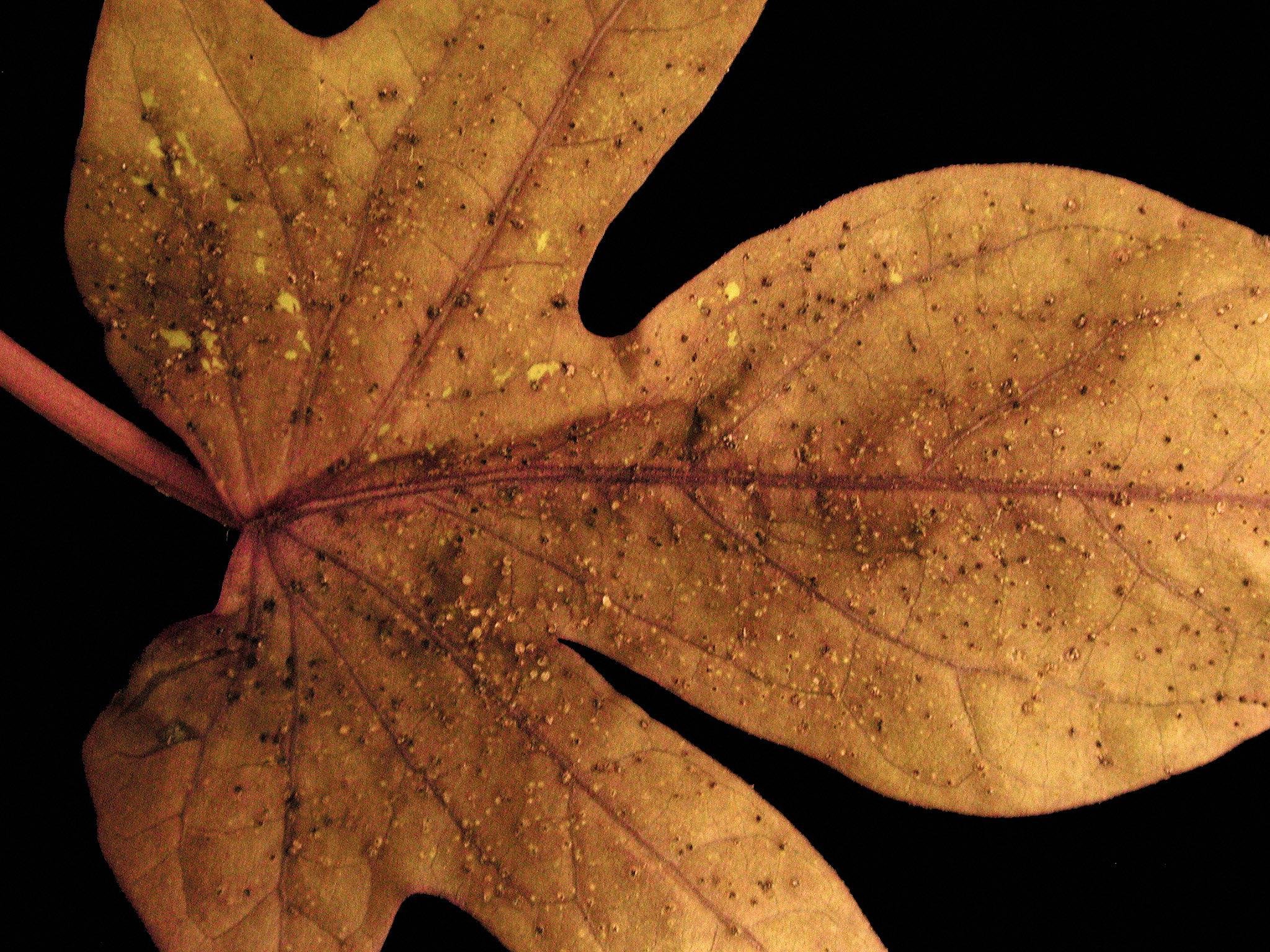 Légende: Protubérances blanchâtres et noires sur une feuille d'ipomée