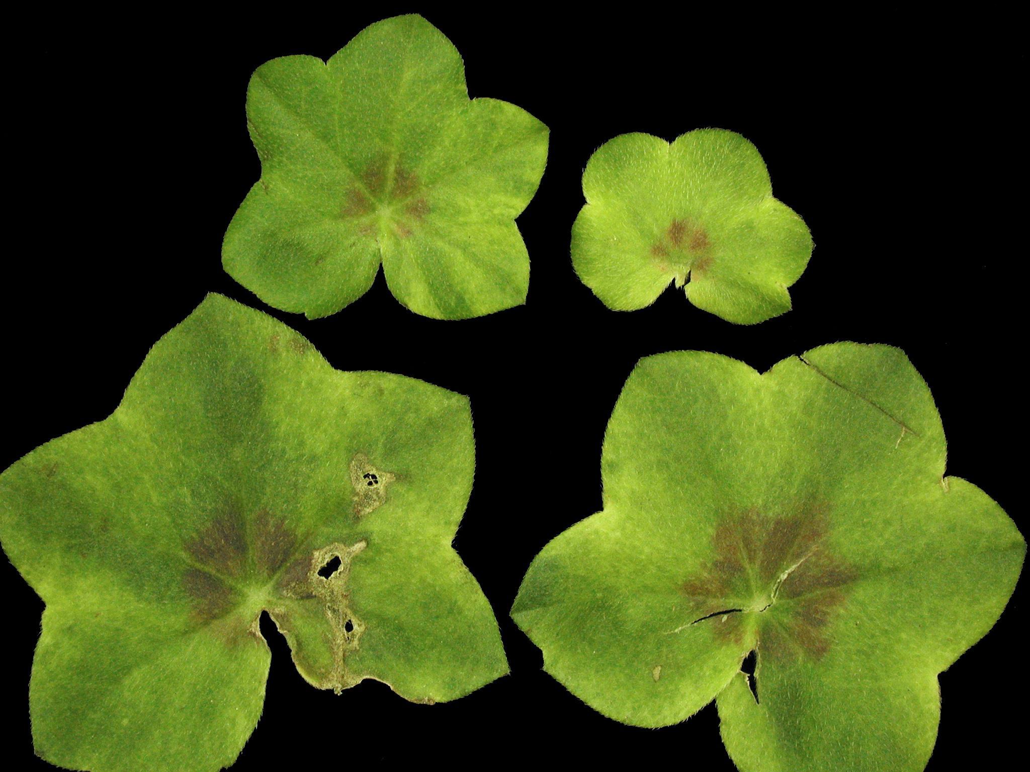 Description: Les jeunes feuilles de géranium lierre (cv 'Global Sangria') provenant d’une serre présentent une marbrure jaune et vert pâle diffuse à presque complètement jaune. Le reste des plants est sans symptôme. Les tests de laboratoire se sont avérés négatifs pour la détection de virus (test sérologique ELISA et microscopie électronique).