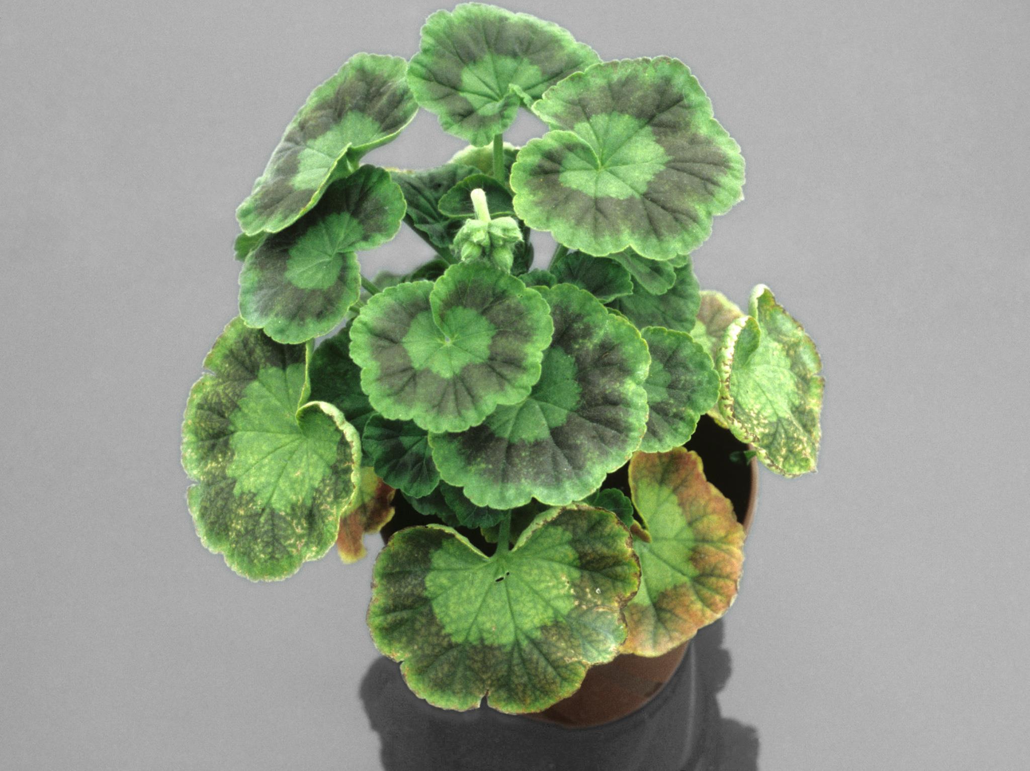 Légende: Taches et rougissement des feuilles basales d’un géranium zonal