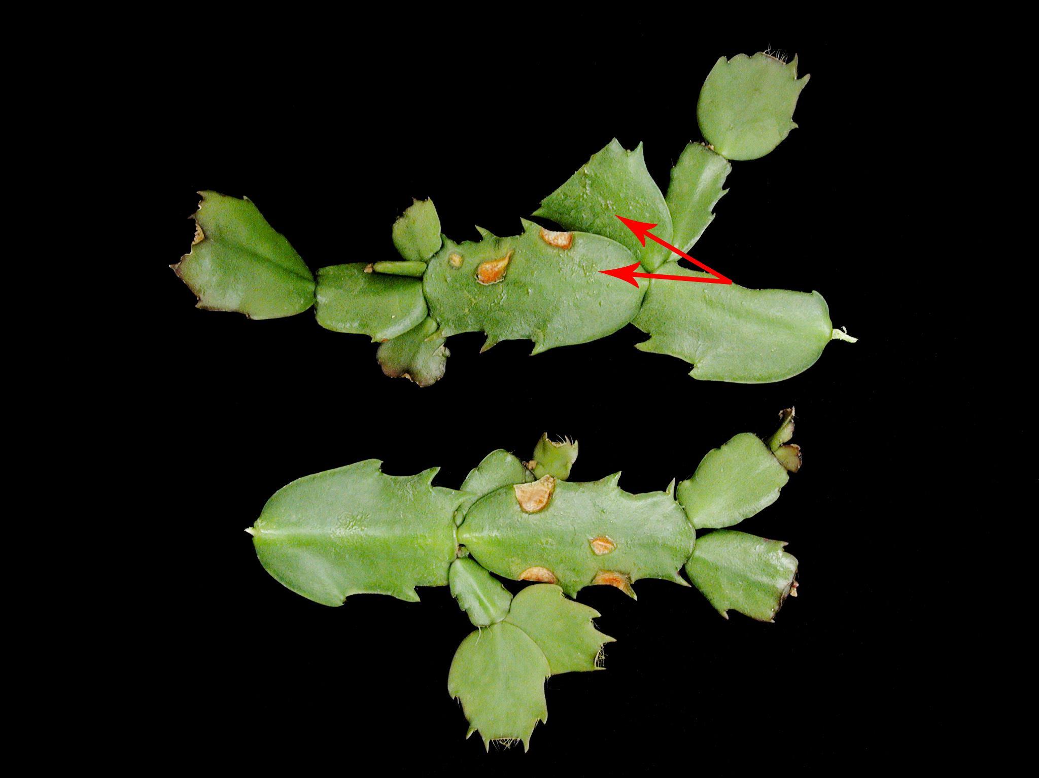 Description: En serre, les cladodes d’un cactus de Noël (cv ‘Thor Vida’) présentent deux types de taches : premièrement des taches orange, légèrement déprimées, et irrégulières et deuxièmement, de minuscules taches verdâtres, surélevées et irrégulières (voir flèches). Ces taches sont présentes à la face supérieure et inférieure. Aucun agent pathogène n’a été détecté des dommages. Le résultat des tests de laboratoire et la nature des dommages confirment la présence d'œdème sur les feuilles.