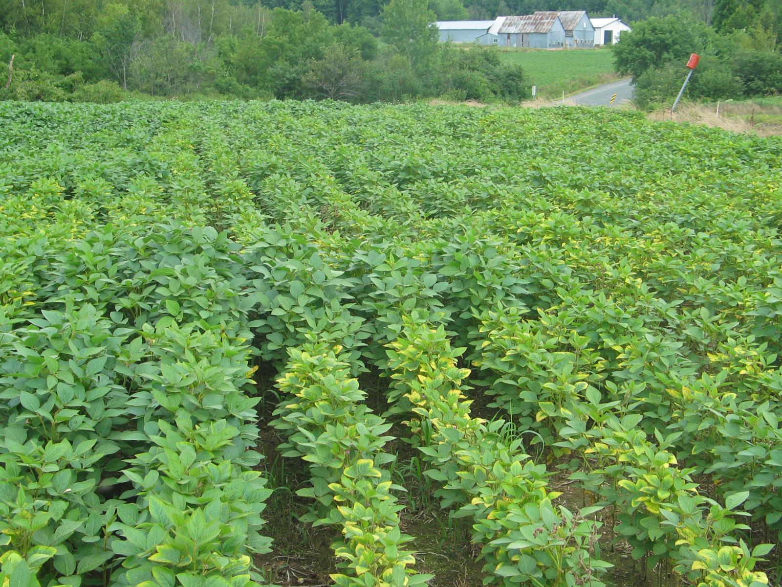 Description: Un champ de soya montre des zones irrégulières où les plants présentent un jaunissement des feuilles terminales. Ces plants sont également un peu moins bien développés que les plants non carencés. L'analyse de sol et foliaire a révélé une carence en potassium. Les zones carencées avaient en moyenne 60 kg/ha de potasse. Pour la culture du soya, un bon sol doit présenter une teneur en potassium de 200 à 250 kg/ha. L'analyse foliaire a, quant à elle, révélé une teneur en potassium de 0,71 % alors qu'un plant sain devrait avoir une teneur en potassium entre 1,7 et 2,5 %. Ce champ n'avait pas reçu d'engrais l’année de la culture. Il est intéressant de noter la grande variabilité du potassium à l'intérieur d'un même champ.