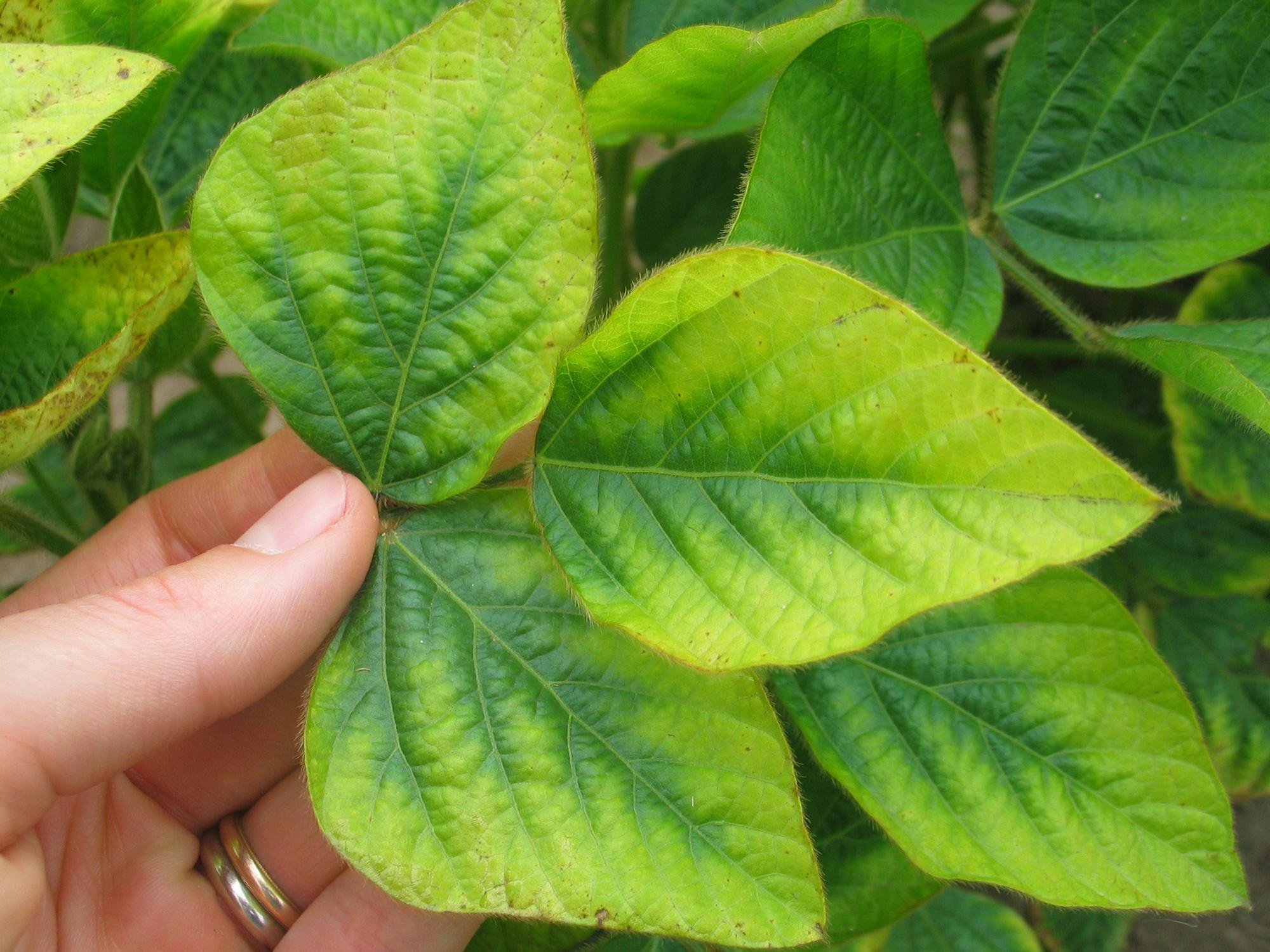 Description: Des feuilles de soya provenant d’une culture biologique montrent un jaunissement débutant à la marge puis progressant sur le limbe. L'analyse de sol et foliaire a révélé une carence en potassium. Les zones carencées avaient 49 kg/ha de potasse. Pour la culture du soya, un bon sol doit présenter une teneur en potassium de 200 à 250 kg/ha. L'analyse foliaire a, quant à elle, révélé une teneur en potassium de 0,57 % alors qu'un plant sain devrait avoir une teneur en potassium entre 1,7 et 2,5 %. Le sol de ce champ n’a pas reçu de fumier depuis l’an 2000.