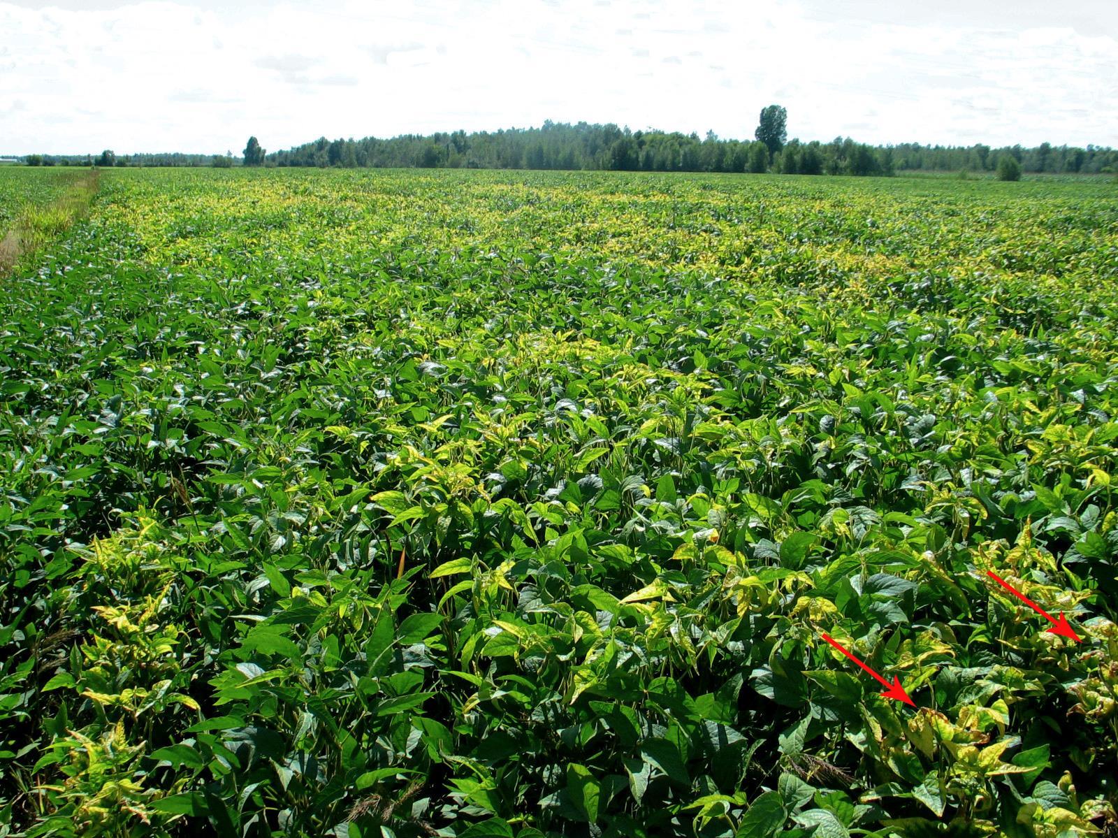 Description: Un champ de soya montre des zones irrégulières où les plants présentent un jaunissement des feuilles terminales et des brûlures marginales (voir flèches). L'analyse de sol et foliaire a révélé une carence en potassium. Les zones carencées avaient en moyenne 60 kg/ha de potasse. Pour la culture du soya, un bon sol doit présenter une teneur en potassium de 200 à 250 kg/ha. L'analyse foliaire a, quant à elle, révélé une teneur en potassium de 0,71 % alors qu'un plant sain devrait avoir une teneur en potassium entre 1,7 et 2,5 %. Ce champ n'avait pas reçu d'engrais l’année de la culture.