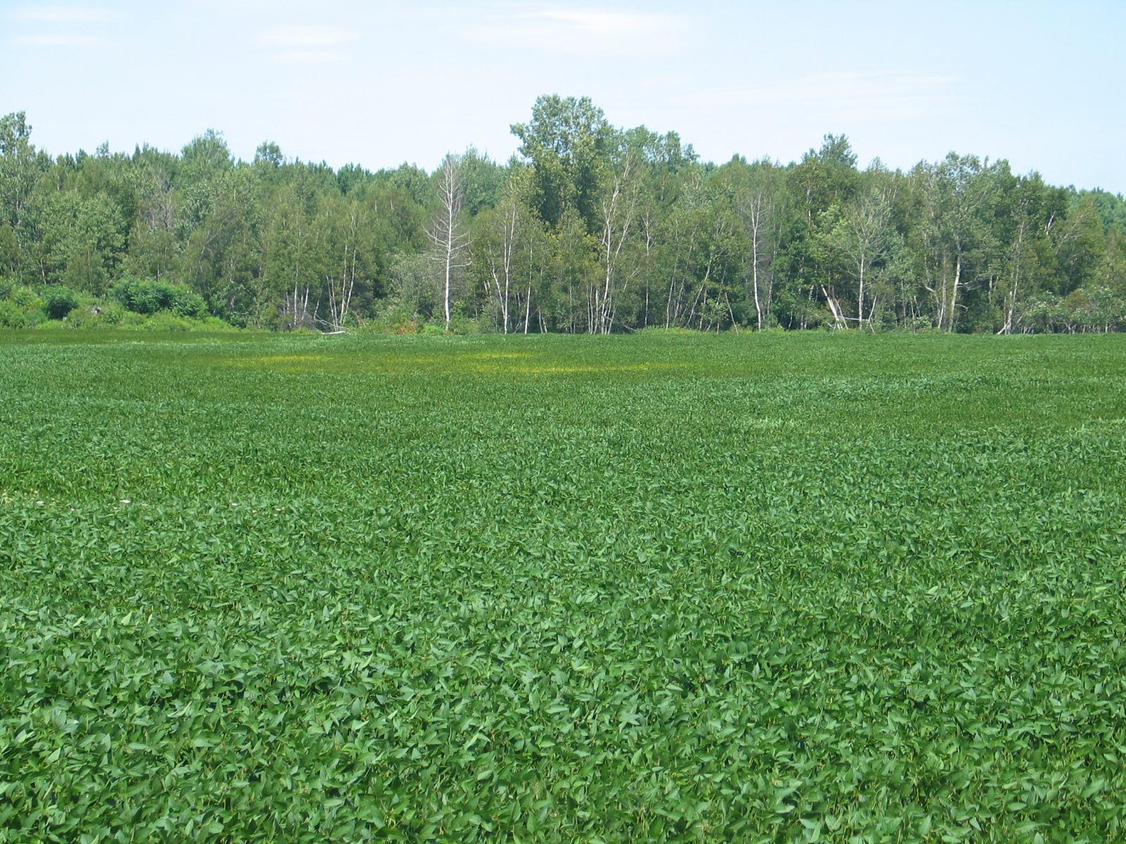 Description: Ce champ de soya a des zones irrégulières où les jeunes plants présentent un jaunissement des feuilles et un faible développement. Les analyses de sol et foliaire ont révélé une carence en manganèse. Il est intéressant de noter la grande variabilité du manganèse à l'intérieur d'un même champ.   Les zones carencées avaient 1 ppm de manganèse. Pour la culture du soya, un bon sol doit présenter une teneur en manganèse entre 10 et 12 ppm. L'analyse foliaire a révélé une teneur en manganèse de 11,8 ppm alors qu'un plant sain devrait avoir une teneur en manganèse autour de 21 ppm.
