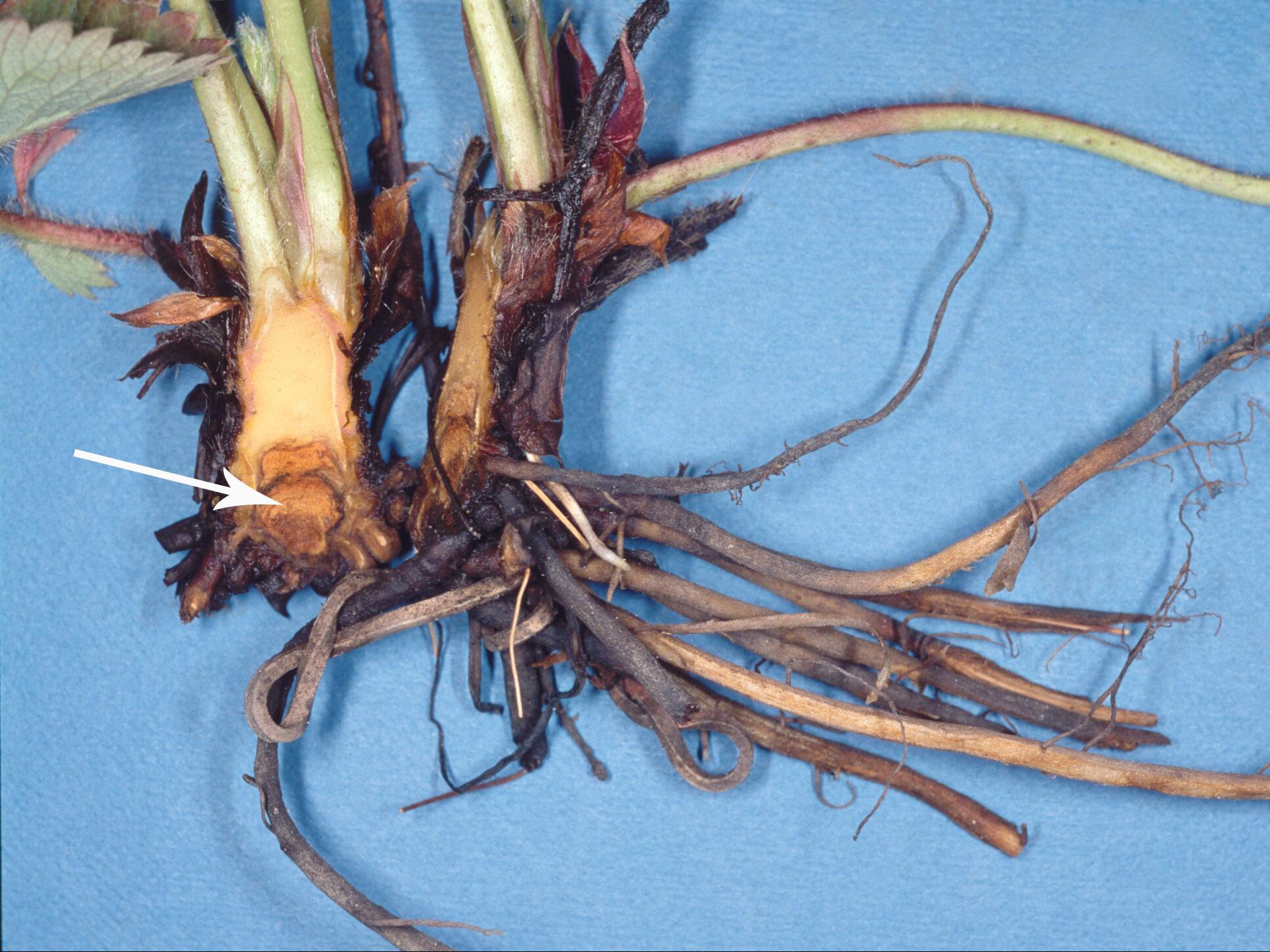 Description: Le collet de ce fraisier (cv 'Kent') a été sectionné en deux longitudinalement pour montrer la coloration brune de la moelle dans sa partie basale (voir flèche). Les plants reçus sont minuscules et le feuillage est peu développé pour la période de l’année (juin). Les racines sont noires, peu abondantes et raides. Ces plants ont subi du gel hivernal léger.