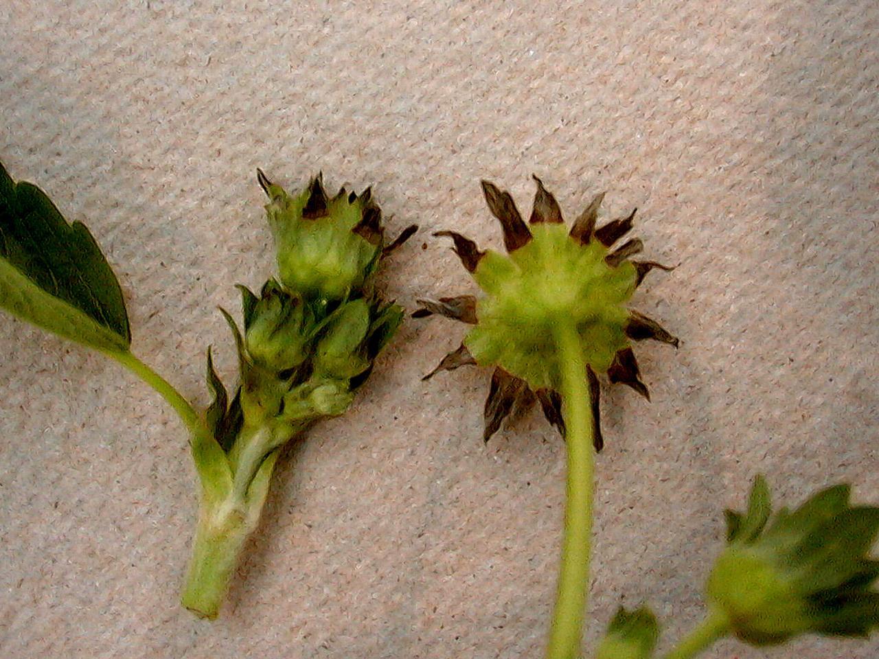 Description: Sur des fraisiers cultivés en serre expérimentale, les sépales des fleurs brunissent à leur extrémité puis sèchent. Sur les mêmes plants, les jeunes feuilles montraient une brûlure apicale ainsi que des déformations et du gaufrage du limbe (non visible ici). Ces dommages sont des symptômes caractéristiques d’une carence en calcium.