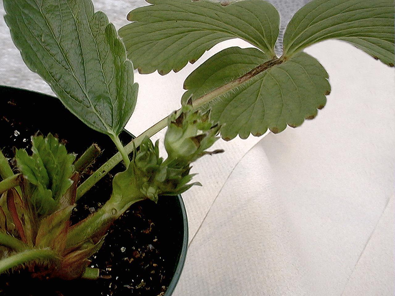 Description: Sur des fraisiers cultivés en serre expérimentale, les sépales des fleurs brunissent à leur extrémité puis sèchent. Une légère brûlure de la pointe des jeunes feuilles et le brunissement du pétiole sont également visibles. Ces dommages sont des symptômes caractéristiques d’une carence en calcium.