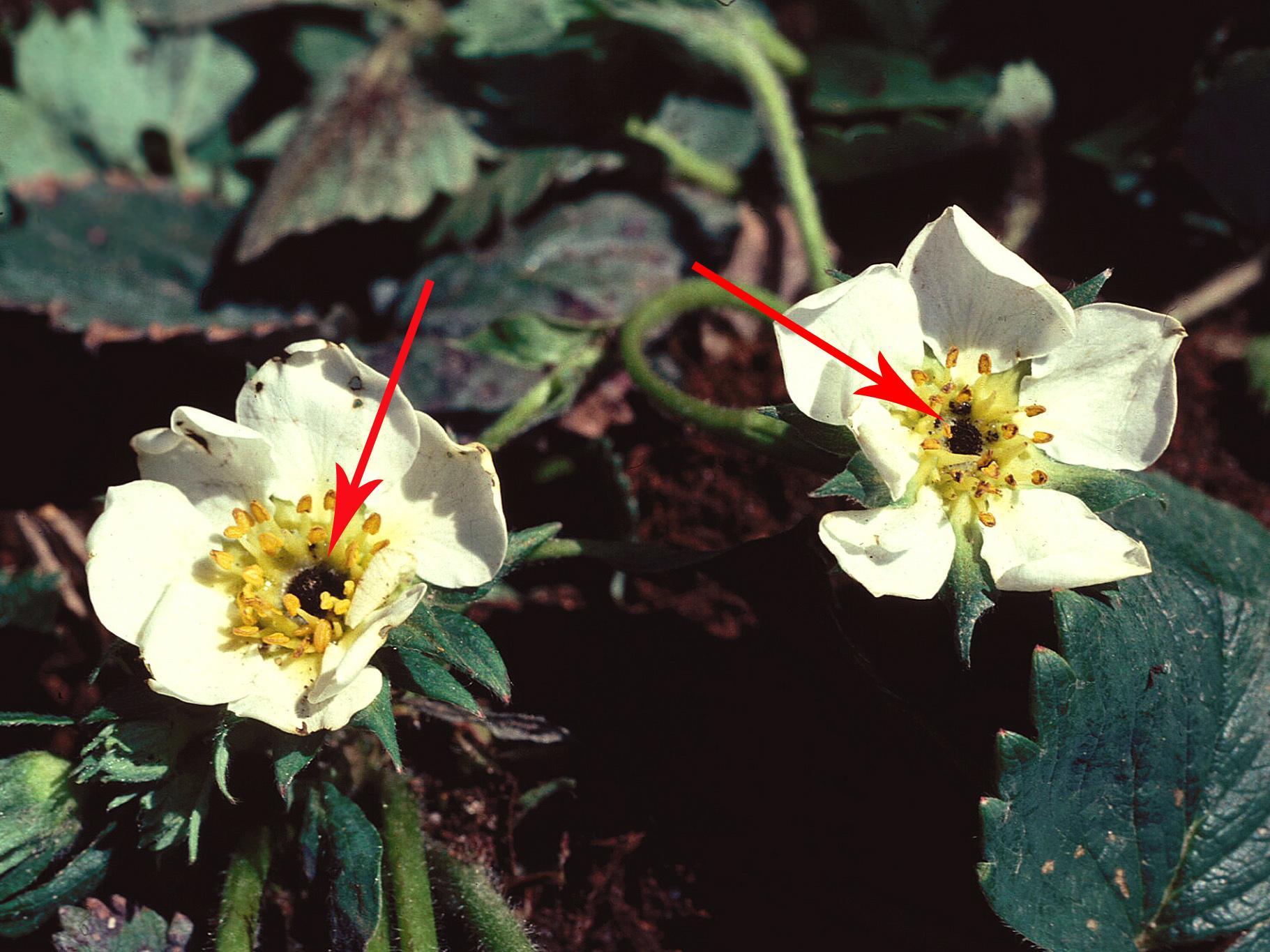 Description: Sur les fleurs de fraisier, tous les pistils sont affectés et le centre de la fleur apparait noirci et brûlé. Les étamines sont noircies et déformées. Les dommages sont causés par un gel printanier. Toutes les fleurs ont gelé partiellement ou complètement.
