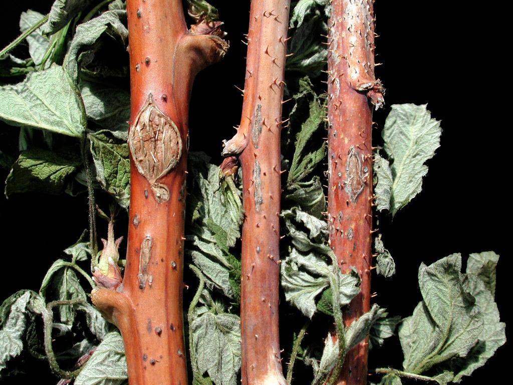 Cette image est issue d'un échantillon reçu au Laboratoire de diagnostic en phytoprotection du MAPAQ en mai 2001. Le conseiller agricole a confirmé qu'il y a eu de la grêle à l'été 2000. Ainsi, la grêle a endommagé les tiges annuelles en 2000, les chancres se sont développés progressivement avec la croissance de la plante alors que les symptômes ont été notés sur les tiges fructifères au printemps 2001. Ces dommages par la grêle sont comparables à ceux observés sur les arbres (voir références indiquées).
