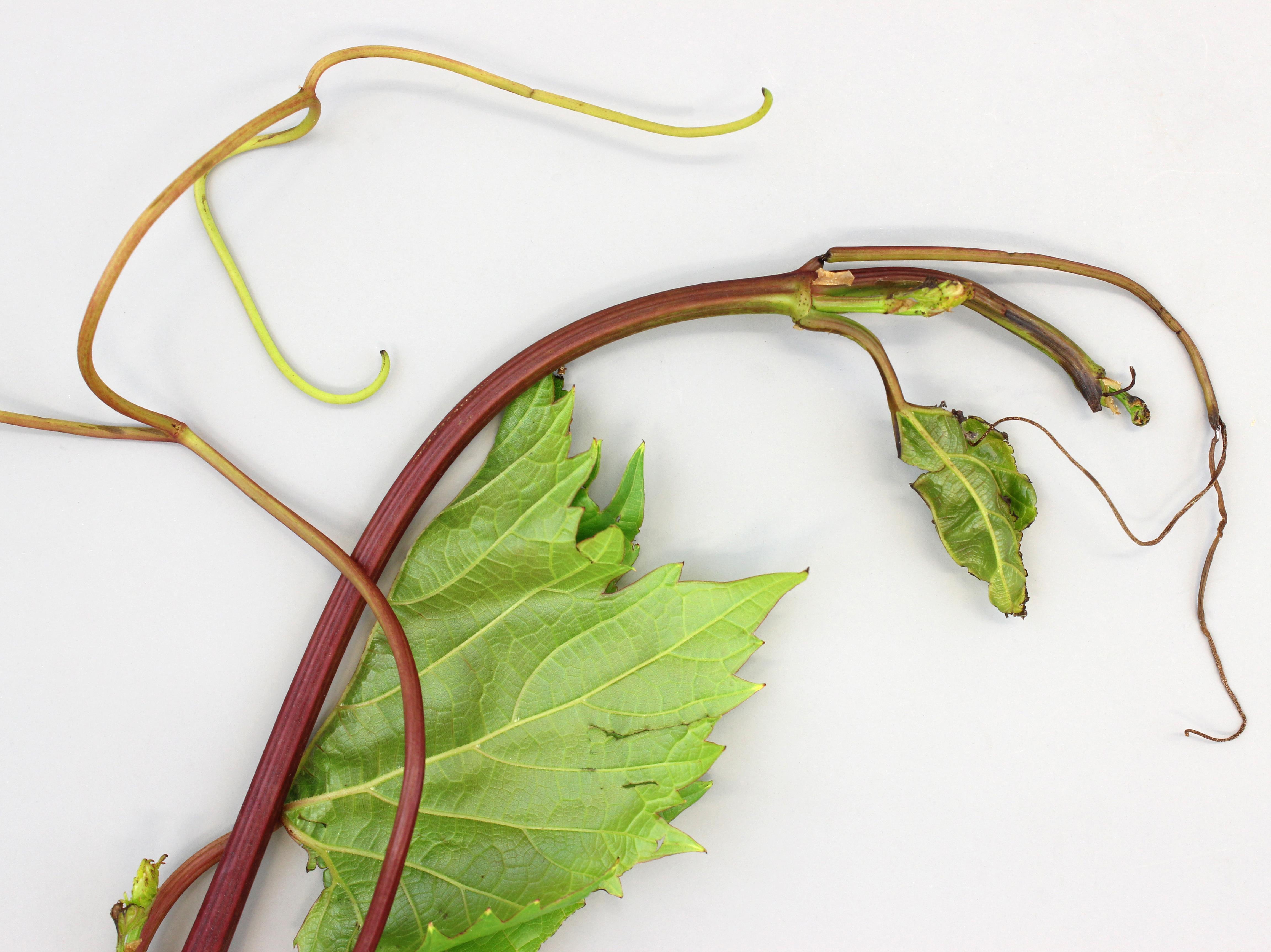 Description: Sur l’extrémité d’une tige annuelle de vigne (cv 'Frontenac gris'), le méristème apical est endommagé, la marge des feuilles est brune et d’aspect brûlé tandis que les vrilles sont brunes et d’aspect humide. La tige est recourbée vers le bas et des taches longitudinales brunes en forme de "zipper" affectent superficiellement l’épiderme. Tous les tests de laboratoire se sont avérés négatifs.