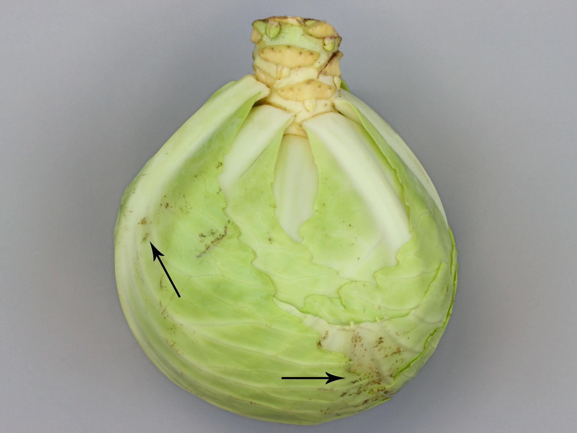 Description: À la face supérieure des feuilles basales et enveloppantes d’un chou pommé (cv 'Bartolo'), présence de taches vitreuses, surmontées de protubérances liégeuses et brunâtres, à différents endroits sur le limbe (voir flèches). Aucun agent pathogène n’a été détecté des dommages. Quelques thrips de l'oignon (Thrips tabaci) ont été observés, mais en quantité insuffisante pour expliquer les dommages. Le résultat des tests de laboratoire, la nature des dommages et la forte proportion de plants affectés au champ (90 %) confirment la présence d'œdème sur les feuilles.