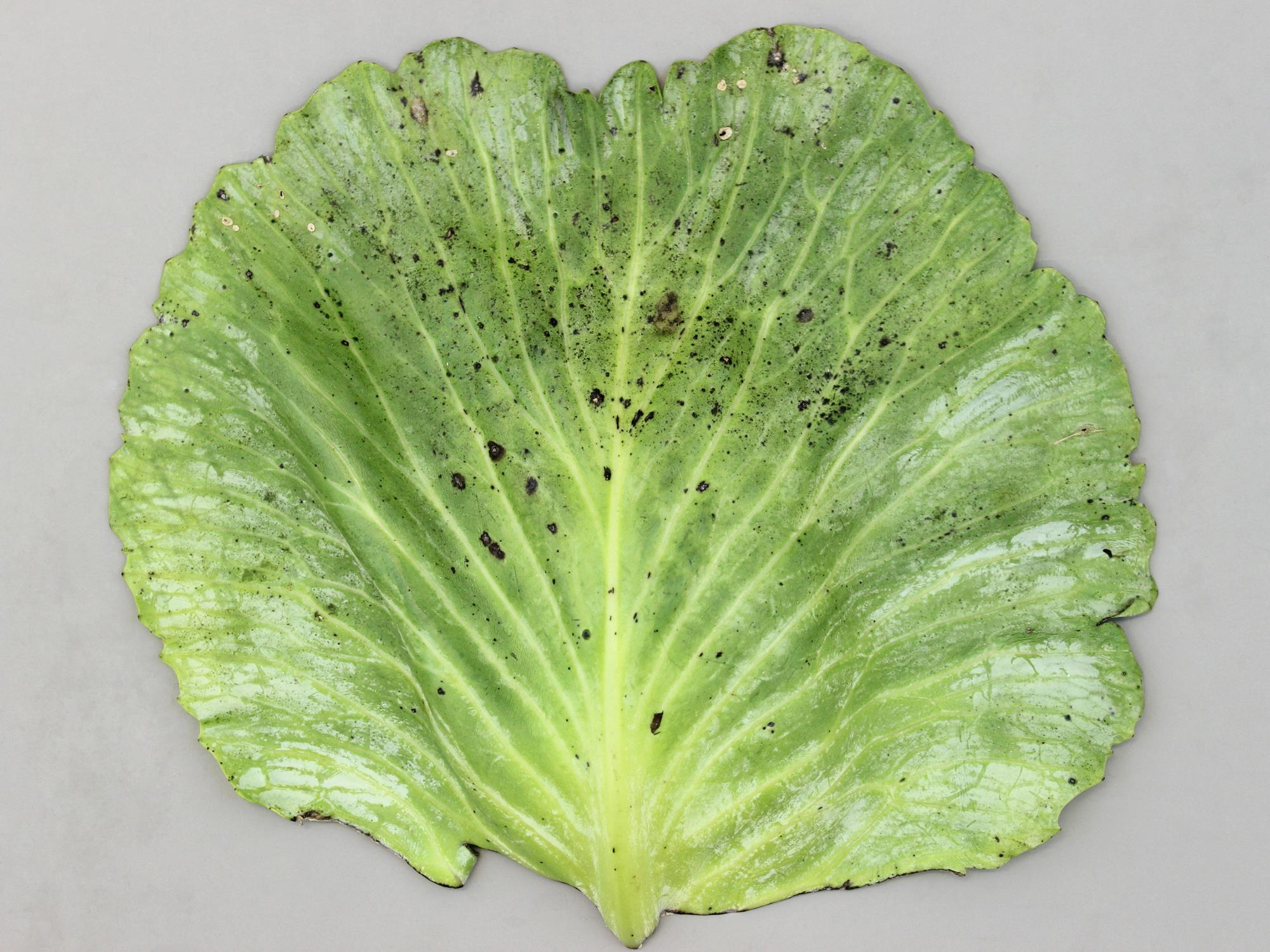 Description: Sur une feuille de chou pommé (cv 'Lennox') provenant d’un champ, présence de petites taches vert foncé à noires, aqueuses, de formes variables et ne traversant pas le limbe. Les dommages sont concentrés à la face inférieure des feuilles externes et dans la partie distale du limbe. Les tests de laboratoire se sont avérés négatifs pour la détection de champignons et de bactéries. Le symptôme est causé par un problème non parasitaire connu sous le nom de nécrose autogène.