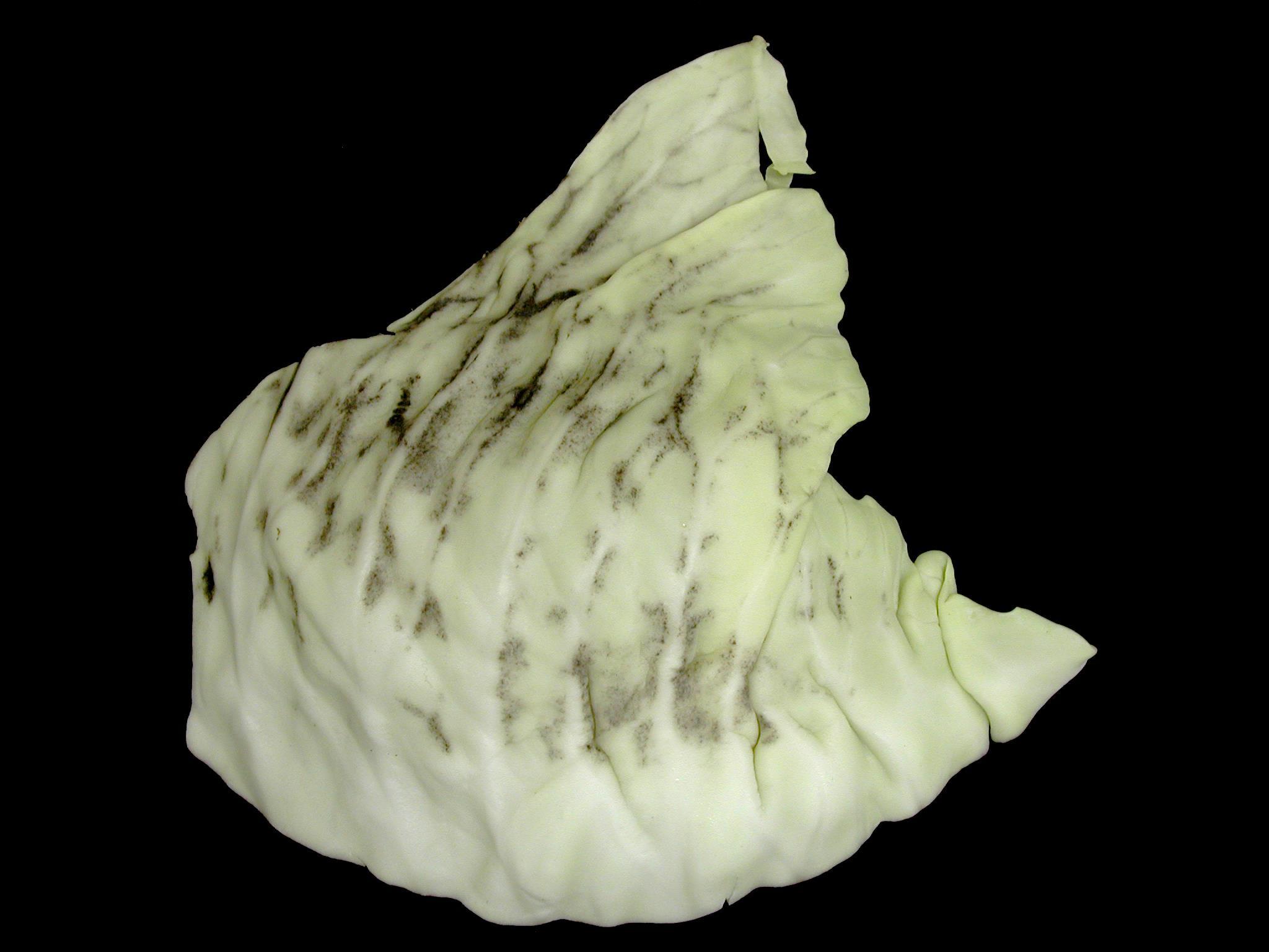 Légende: Noircissement des nervures d'une feuille de chou pommé