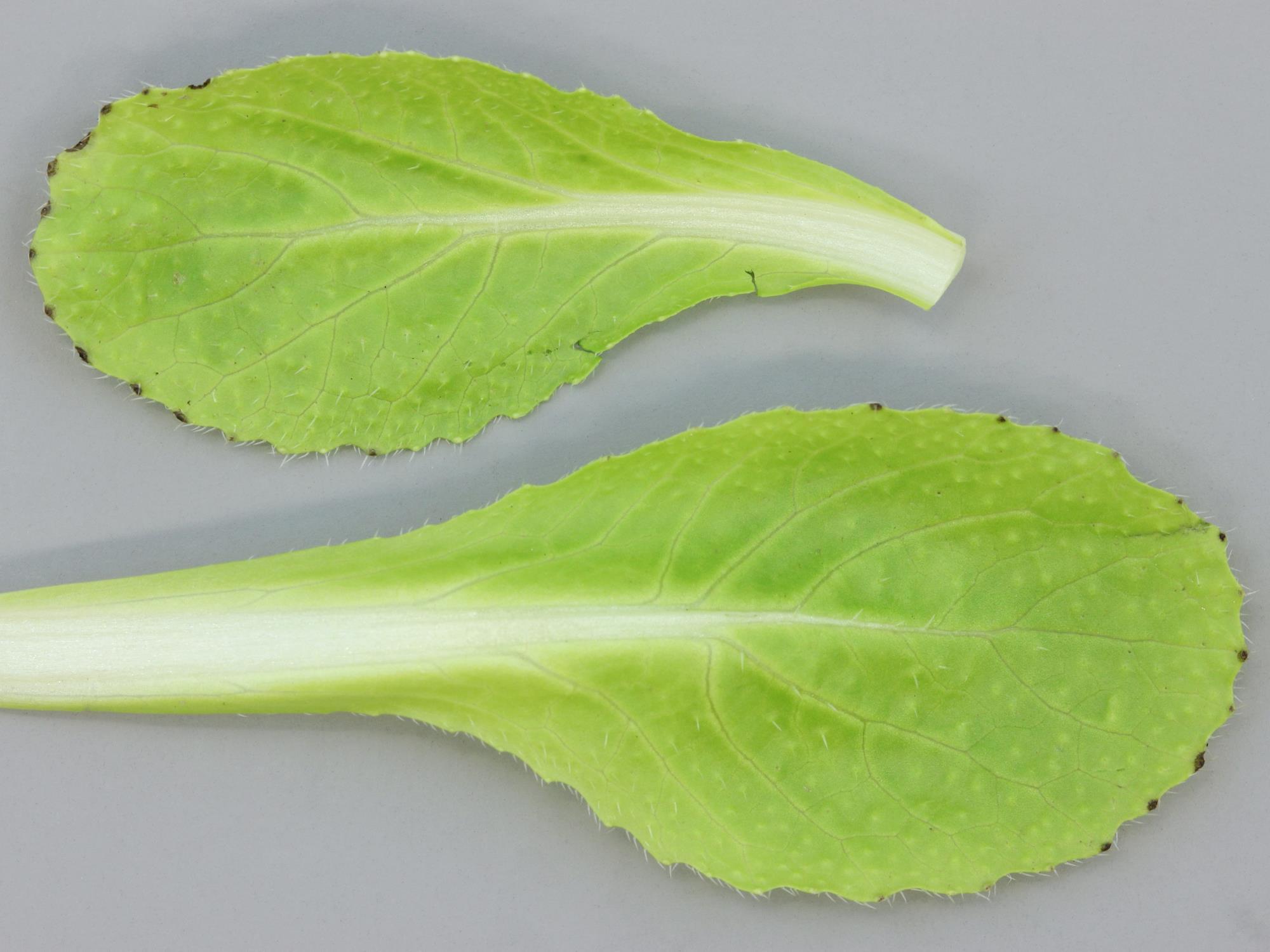 Description: Sur des feuilles de transplants de chou chinois provenant d’une serre, présence de petites taches noires uniformément disposées à la marge des feuilles et correspondant à l'emplacement des hydatodes. Ce dommage est caractéristique de la guttation.