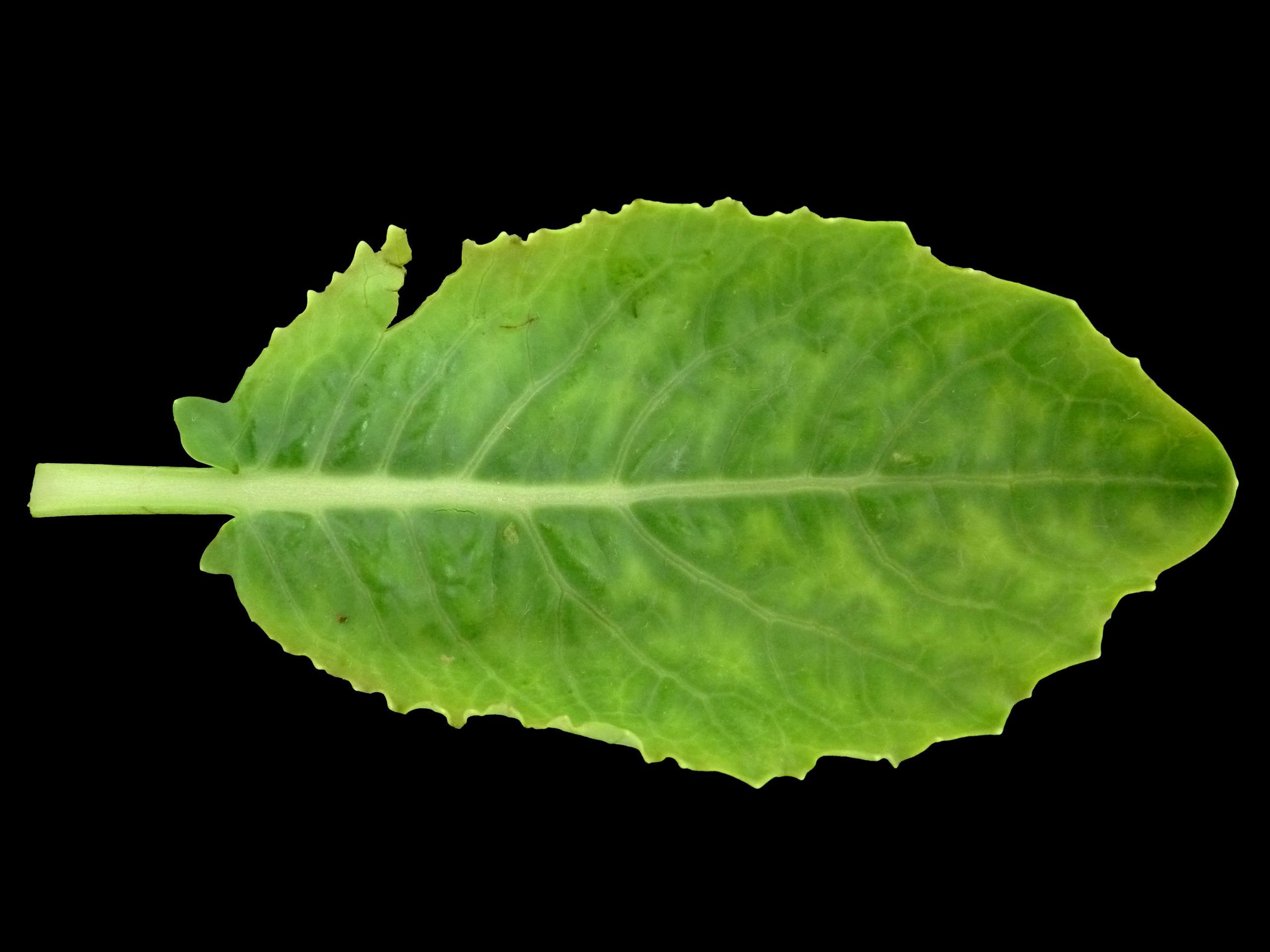 Description: Sur une feuille d’un transplant de chou-fleur (cv 'Minuteman') provenant d’un champ, présence d’un jaunissement entre les nervures. Les nervures demeurent vertes. Les feuilles sont petites et cassantes. Tous les niveaux de feuille sont affectés. Les racines sont blanc grisâtre (non visible ici). L'analyse minérale du sol a révélé une carence en magnésium (89 ppm). La carence survient lorsque le niveau de magnésium dans le sol est inférieur à 100 ppm. L’échantillon était composé de transplants de chou-fleur qui ont été plantés dans un sol sableux.