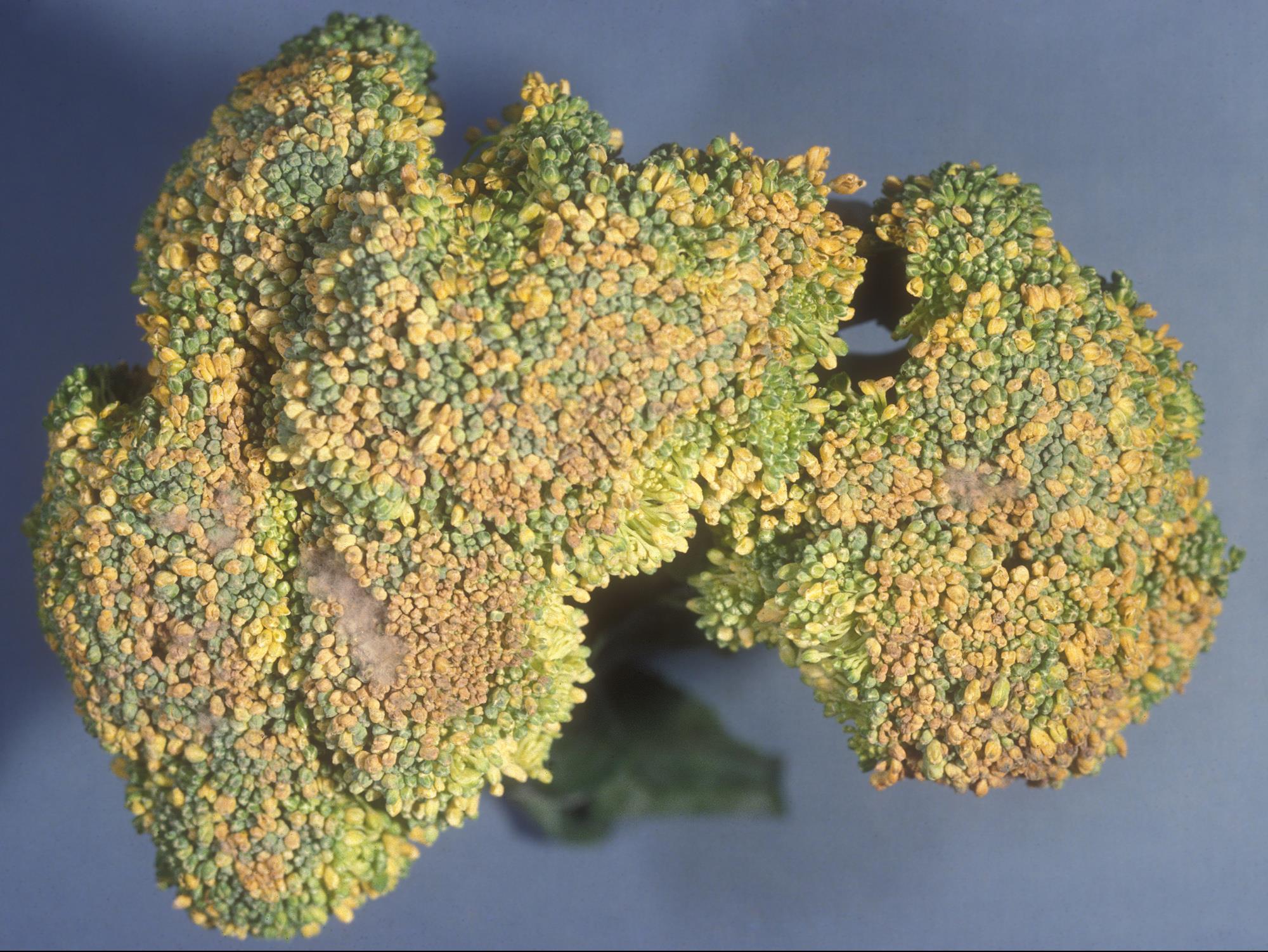 Description: Présence d’un jaunissement à brunissement des boutons floraux d’une inflorescence d’un brocoli provenant d’un champ. La partie centrale est la plus affectée. Un début de pourriture est également perceptible sur le capitule. Le développement des fleurons est également inégal, certains sont particulièrement développés tandis que d’autres sont petits. Les tests de laboratoire se sont avérés négatifs pour la détection de bactéries. Le symptôme observé est caractéristique d’un désordre physiologique connu sous le nom de granulée brune. La conseillère agricole mentionne sur la fiche de renseignements qu’il y a eu des températures élevées et des pluies abondantes.