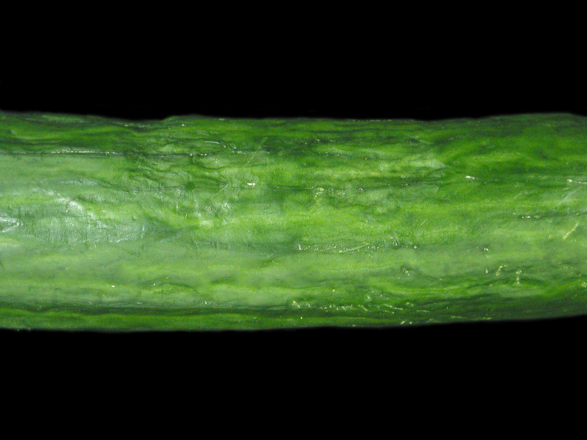 Description: Sur l’épiderme d’un concombre de serre (cv 'Suprami') provenant d’un entrepôt, présence de dépressions sur le fruit dans lesquelles croît un mycélium blanchâtre. Les premières dépressions se localisent d’abord entre les grosses nervures. Il n’y a pas de dommage visible dans la chair sous les dépressions (non visible ici). Les tests de laboratoire ont révélé la présence de champignons et de bactéries secondaires. Il s’agit probablement de dommages causés par une température trop froide en entrepôt ("chilling injury").