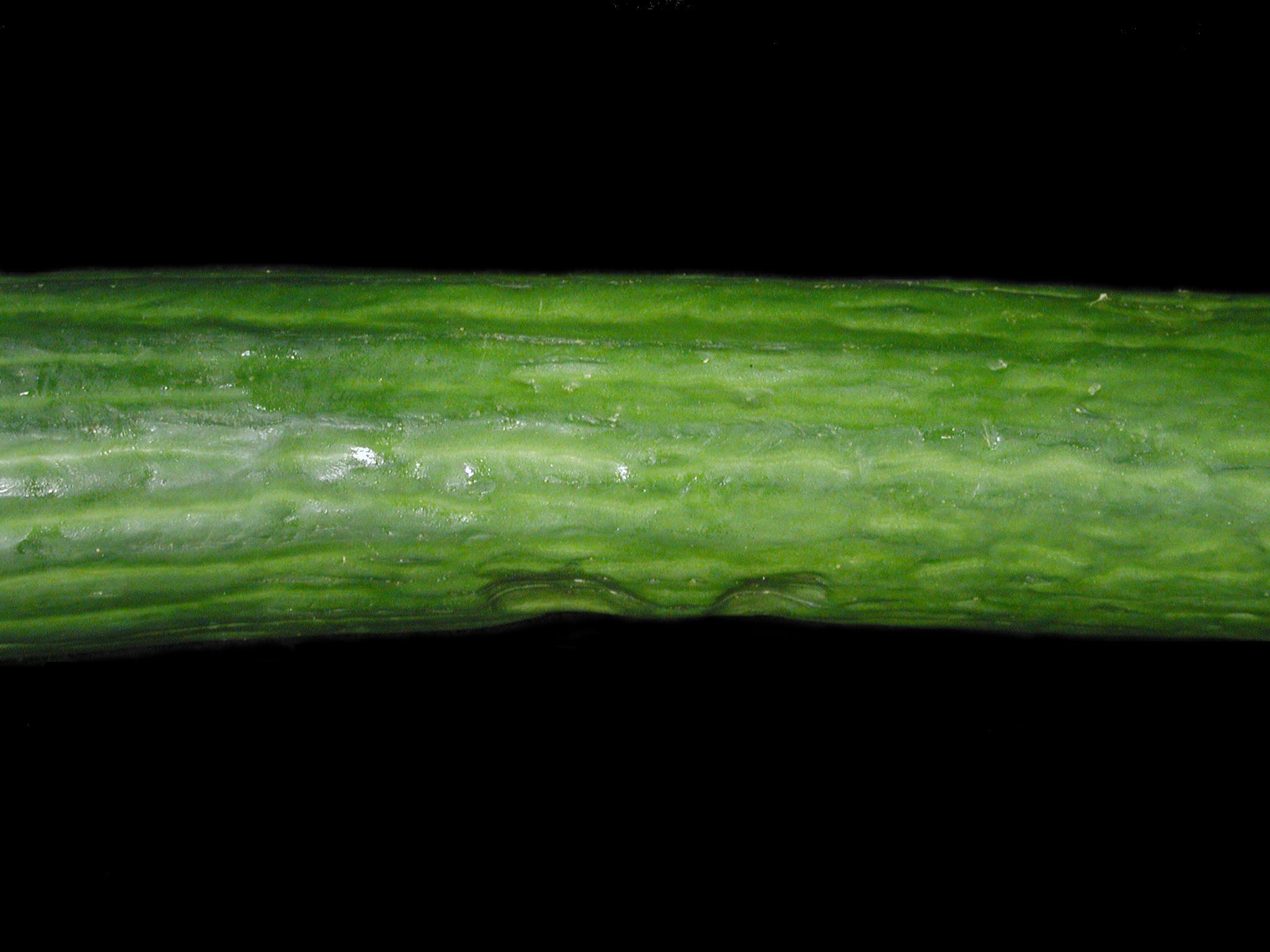 Description: Sur l’épiderme d’un concombre de serre (cv 'Suprami') provenant d’un entrepôt, présence de dépressions sur le fruit dans lesquelles croît un mycélium blanchâtre. Les premières dépressions se localisent d’abord entre les grosses nervures. Il n’y a pas de dommage visible dans la chair sous les dépressions (non visible ici). Les tests de laboratoire ont révélé la présence de champignons et de bactéries secondaires. Il s’agit probablement de dommages causés par une température trop froide en entrepôt ("chilling injury").   Selon le conseiller agricole, lors de la récolte des fruits dans la serre, ceux-ci étaient sans symptôme. Les dommages sont donc survenus lors de l’entreposage.