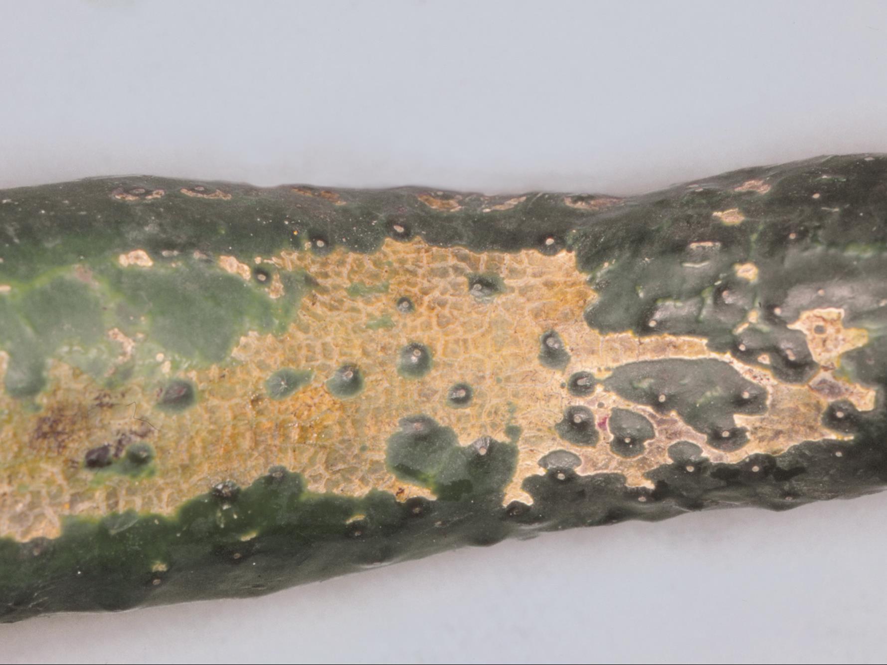 Description: Présence de larges plages ou gerçures subérisées, beiges à brunes, disposées à la face concave (supérieure) des concombres de champ. L'épiderme environnant les dommages est vert pâle. La chair est sans symptôme (non visible ici). Aucun agent pathogène n’a été observé des dommages. Considérant le type de dommage, les basses températures nocturnes enregistrées au début du mois d’août de cette année-là, les fortes rosées et le fait que les dommages sont situés sur un seul côté du fruit (partie opposée au sol), il s'agit probablement de la gerçure.