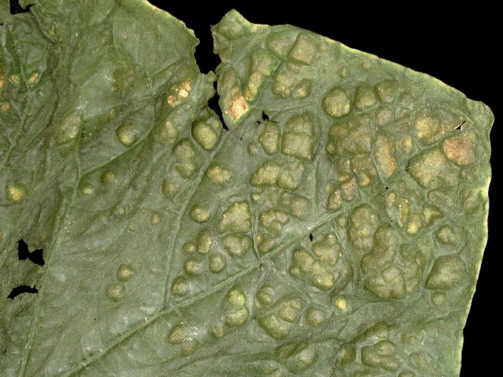 Description: En serre, les feuilles de concombre (cv 'Dominica') présentent des déformations se manifestant par des protubérances jaune verdâtre. Chaque feuille compte entre 10 et 30 protubérances qui mesurent entre 1 et 2 cm de diamètre. Le symptôme est visible à la face supérieure. Aucun agent pathogène n’a été détecté des dommages. Le résultat des tests de laboratoire et la nature du dommage confirment la présence d'œdème sur les feuilles.