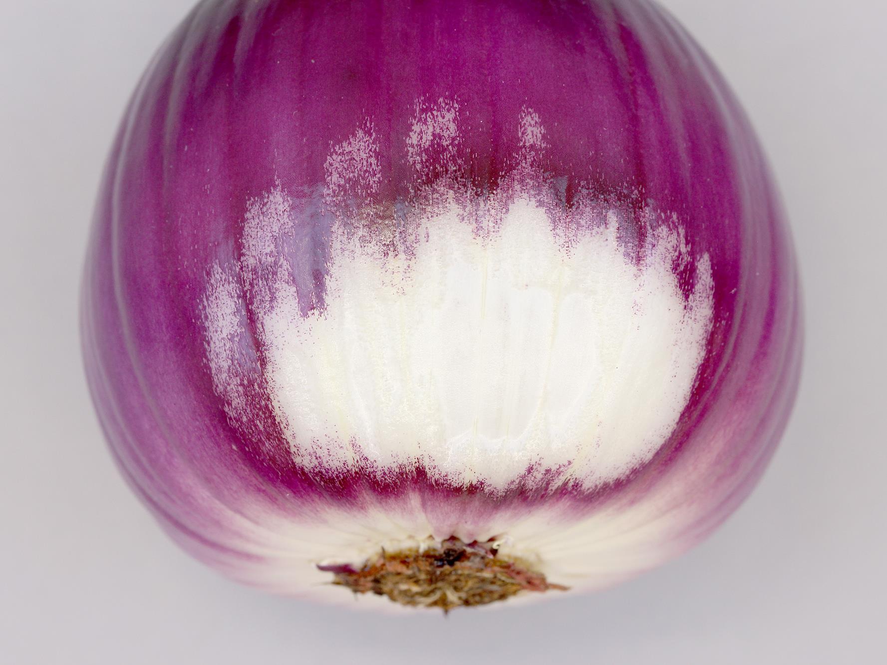 Description: Sous les tuniques sèches d’un oignon rouge, présence d’une grande tache blanchâtre dont le centre est mou. La tache est sur un seul côté du bulbe. Ce symptôme est caractéristique d’une insolation (journée très ensoleillée), jumelée à une température élevée et des conditions sèches. Cet échantillon provient d’un champ où les oignons étaient arrachés et séchaient en andain sur une terre noire. Les bulbes qui étaient sur le dessus sont les plus affectés, car ils sont exposés directement aux rayons du soleil.
