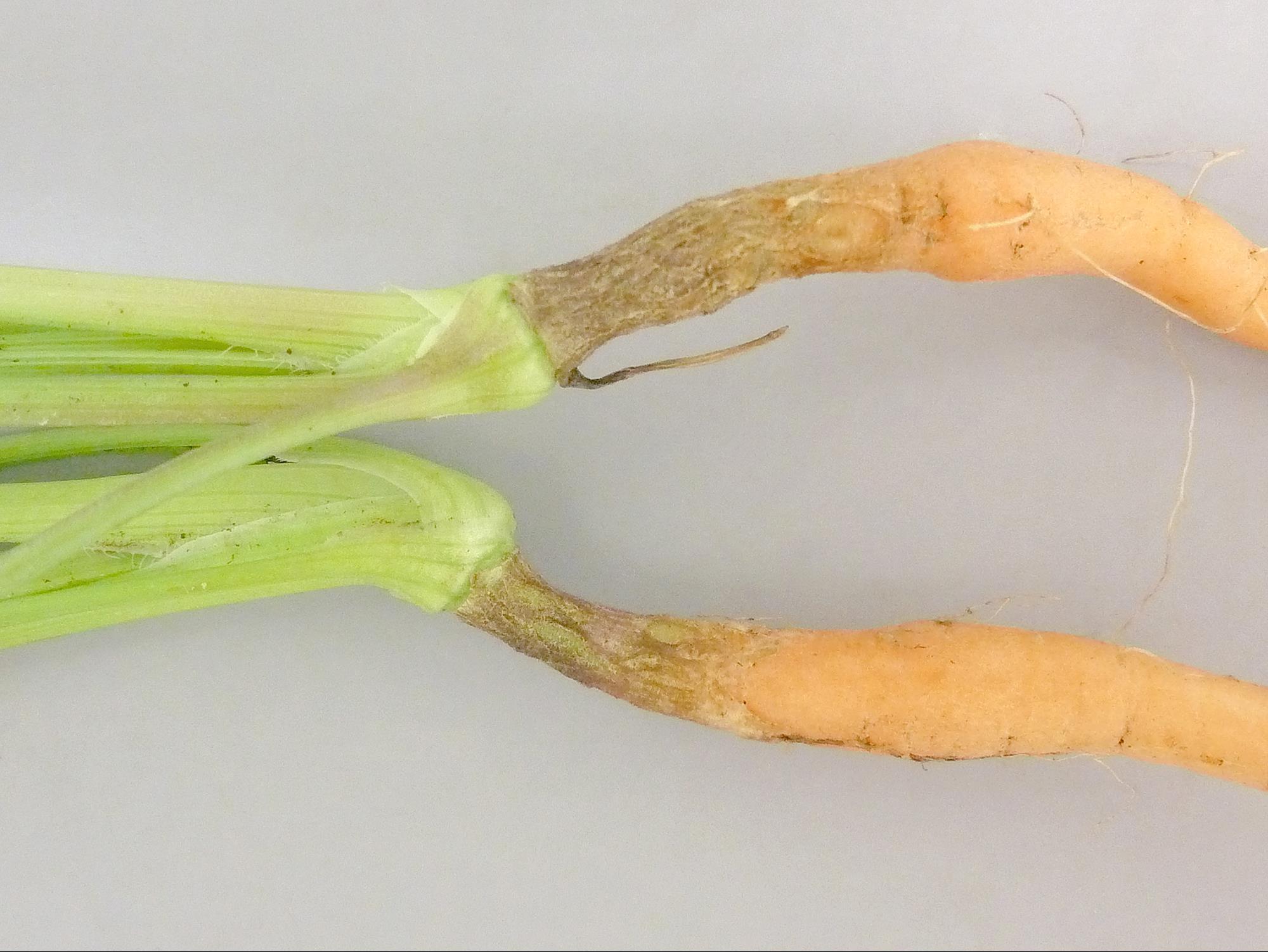 Description: Sur de jeunes plants de carottes (cv 'Endy') cultivés au champ, présence d’une constriction brunâtre, liégeuse et superficielle au collet. La racine est sans symptôme. Ce symptôme est typique d’un chancre de chaleur causé par des températures élevées à la surface du sol. Les plants affectés (10 %) sont cultivés en terre noire et distribués en foyer, au centre du champ. Il y avait probablement des îlots de chaleur à cet endroit.