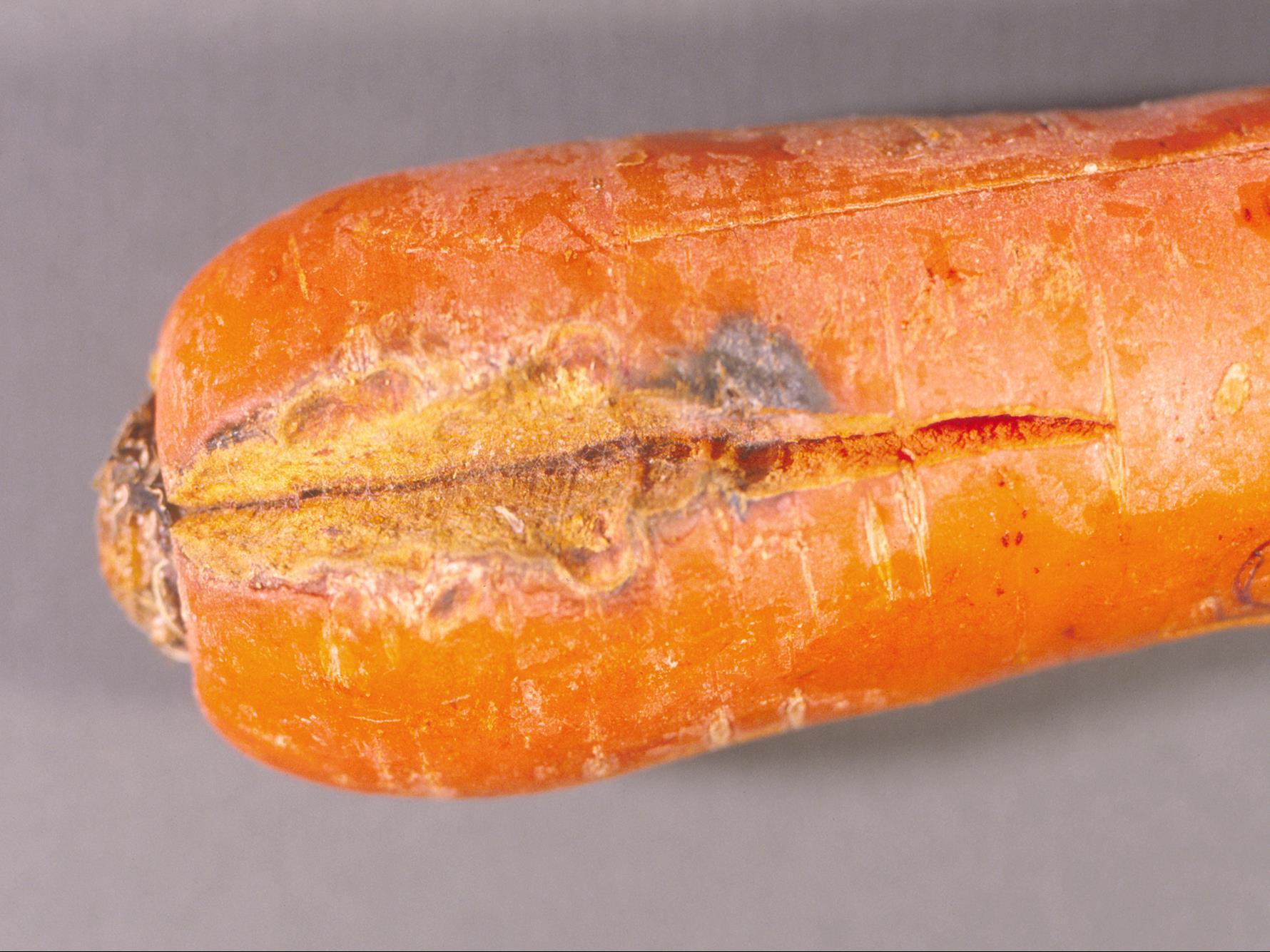 Description: Lors des premières récoltes au champ, présence d’une courte fente longitudinale dans la partie supérieure d’une carotte, près du collet. La chair autour de la fente est subérisée. Il y a absence de pourriture ou de dommages d’insectes. La fente est causée par des variations de l’humidité du sol imputable à une sécheresse qui est survenue au cours de la saison de production.