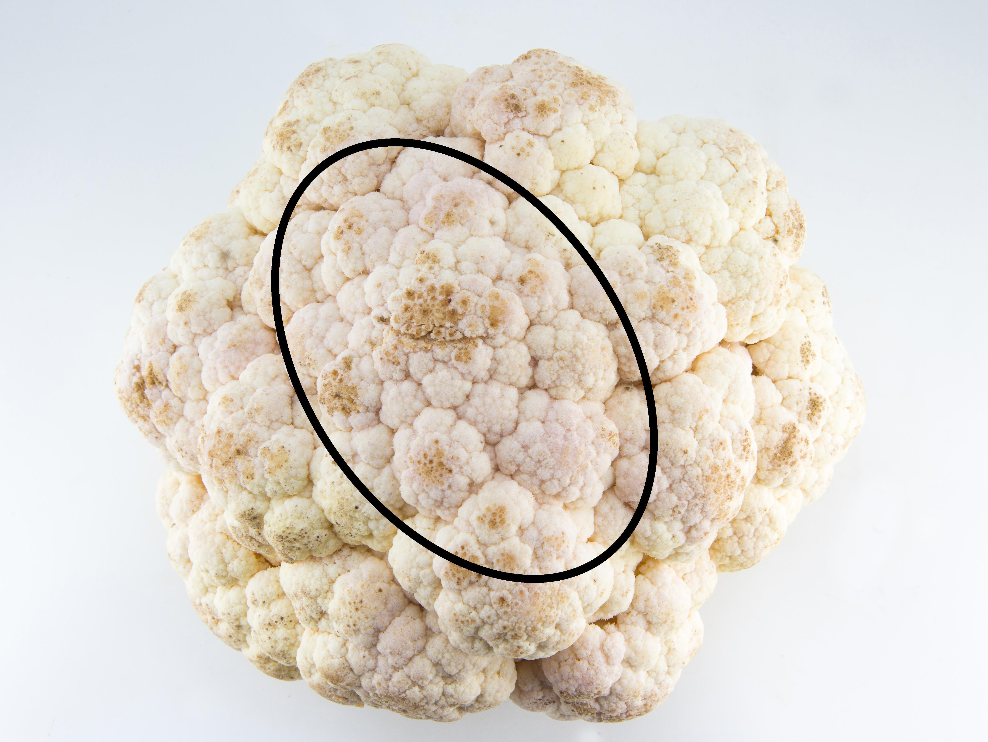 Description: Sur l’inflorescence d’un chou-fleur (cv 'Casper') provenant d’un entrepôt, présence d’une pigmentation rose pâle des fleurons couvrant subtilement le dessus du chou-fleur (voir cercle). Les côtés sont parfois affectés. Ce symptôme est caractéristique du désordre physiologique appelé "riciness". La conseillère agricole mentionne qu’à la récolte, la teinte rosée était à peine perceptible et observée sur de petites zones. Ce symptôme s’est accentué lors de l’entreposage et affecte 5 % des choux-fleurs.