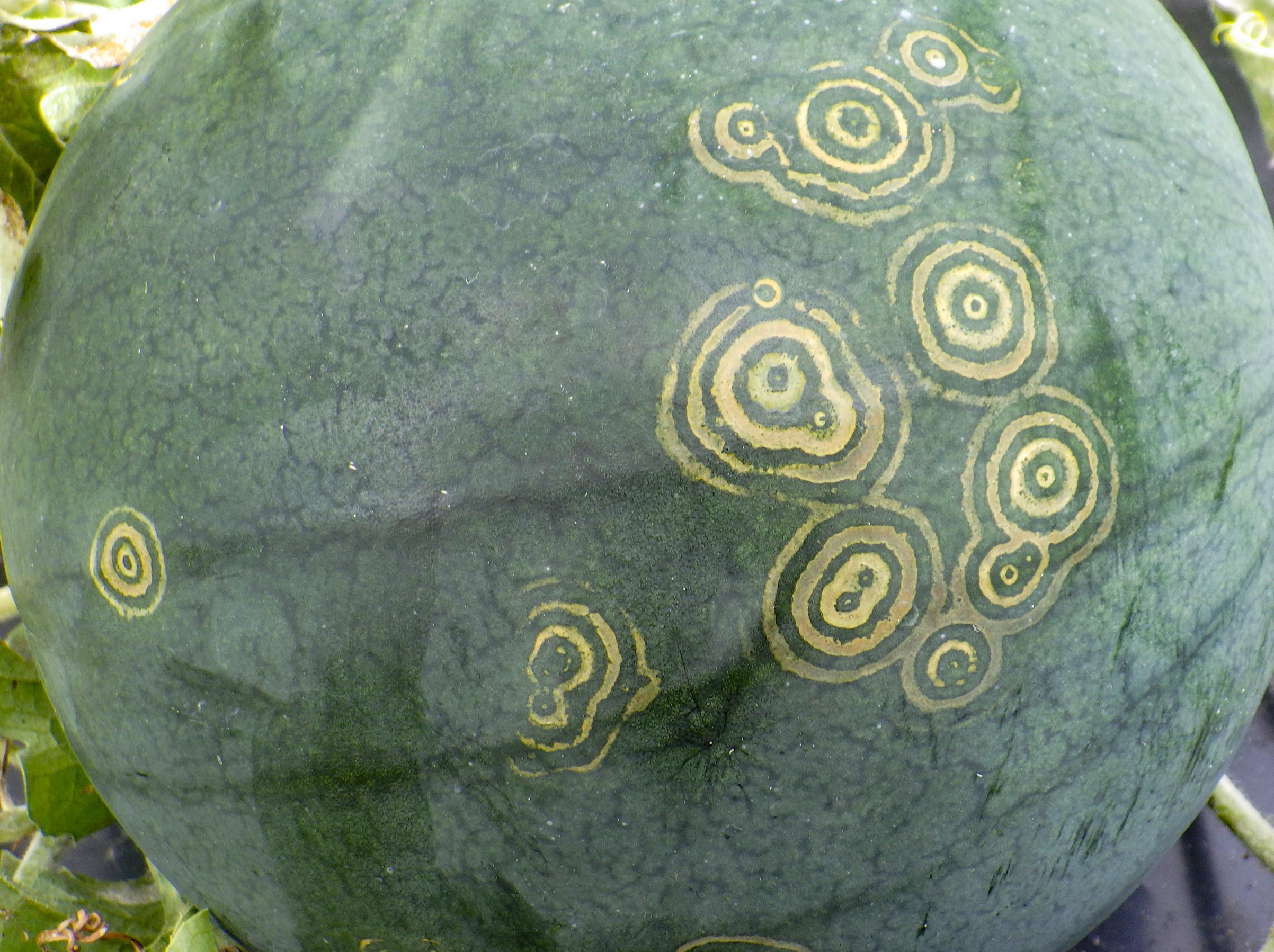 Légende: Anneaux concentriques sur la peau d'un melon de la varitété Sugar baby.