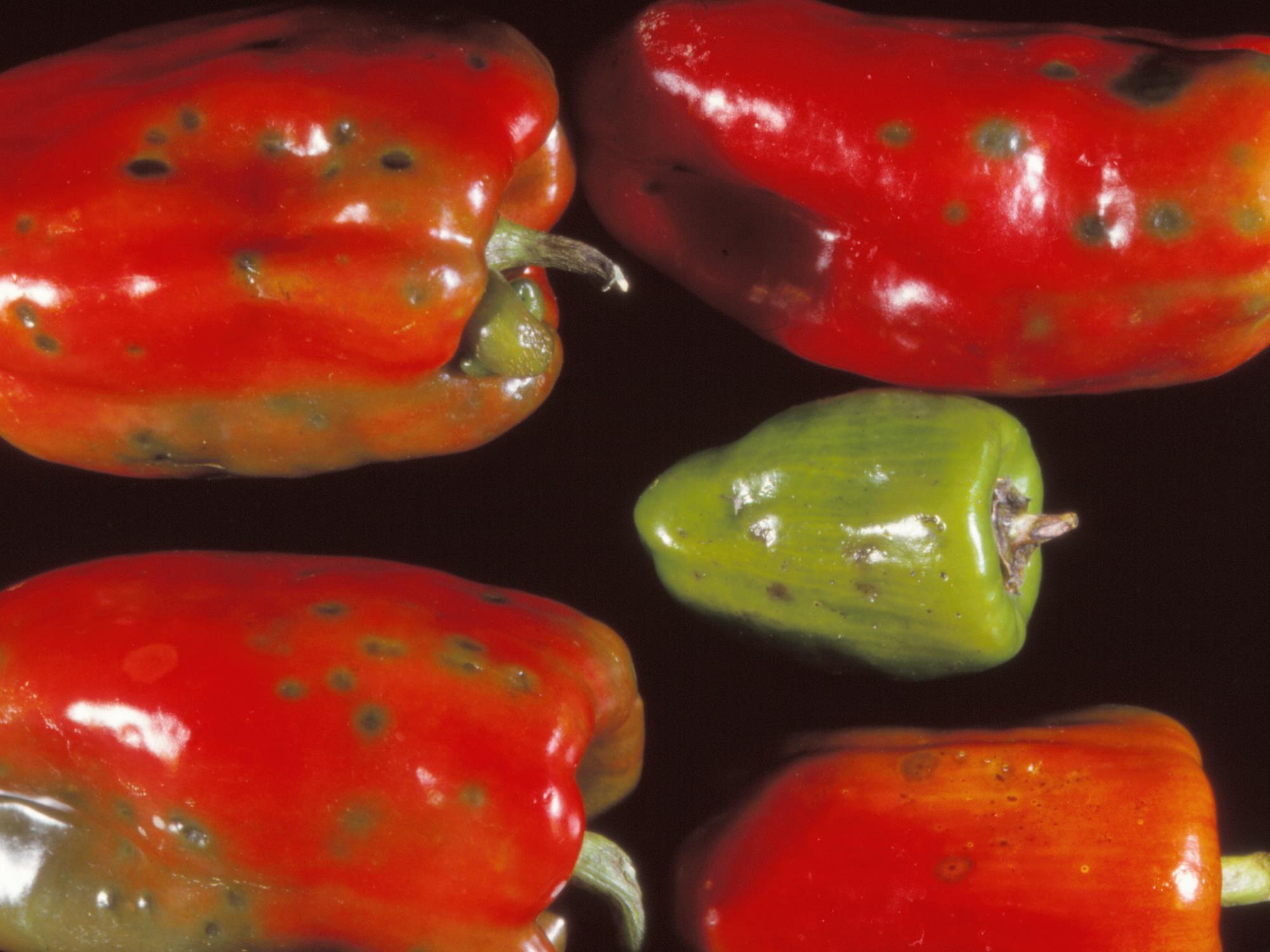 Description: L’épiderme des poivrons montre des taches circulaires noires réparties aléatoirement sur le côté des fruits. Chez le poivron, ce symptôme est caractéristique de la tache amère ("stip") causée par un excès de calcium dans le fruit.
