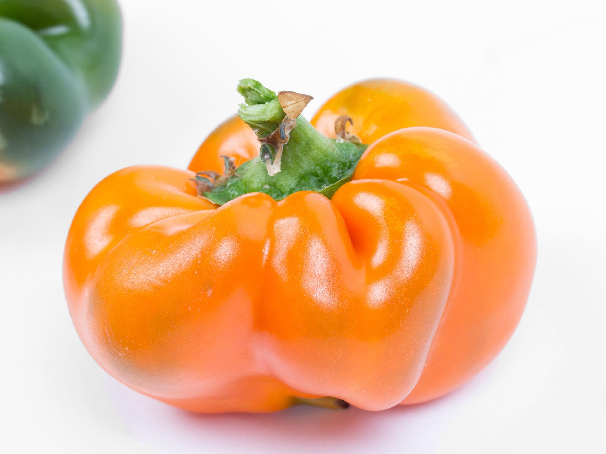Description: Un poivron (cv 'Magno') est de petite taille et aplati. Il porte peu de graines (non visible ici). Chez le poivron, les fruits difformes sont caractéristiques de grands écarts de température entre le jour et la nuit lors de la floraison, ce qui entraîne une pollinisation inadéquate. Dans ce cas, il est fort probable que les écarts de température soient liés au froid.