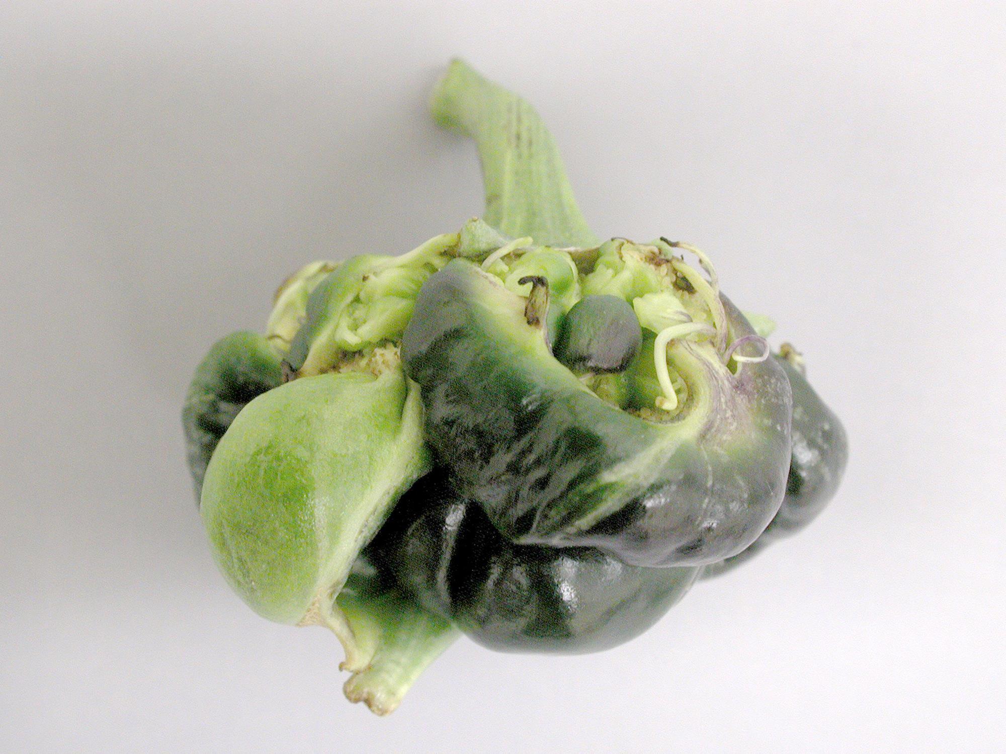 Description: Un poivron (cv 'Mini Chocolate Bell') est sévèrement déformé. Les tissus sont éclatés et boursouflés et le fruit porte peu de graines. Chez le poivron, les fruits difformes sont caractéristiques de grands écarts de température entre le jour et la nuit lors de la floraison, ce qui entraîne une pollinisation inadéquate. Dans ce cas, il est fort probable que les écarts de température soient liés au froid.