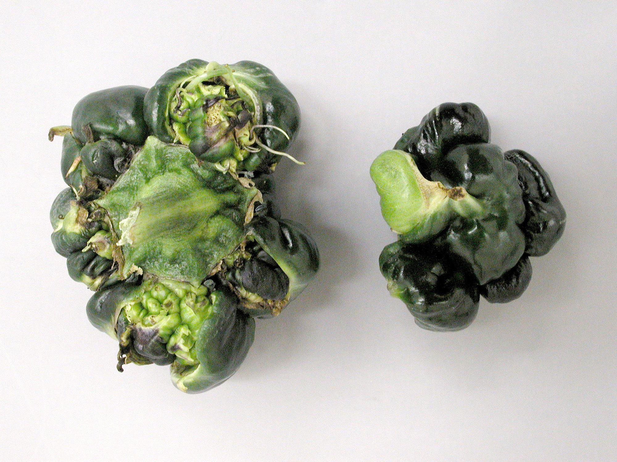 Description: Des poivrons (cv 'Mini Chocolate Bell') sont sévèrement déformés. Les tissus sont éclatés et boursouflés. Les fruits portent peu de graines. Chez le poivron, les fruits difformes sont caractéristiques de grands écarts de température entre le jour et la nuit lors de la floraison, ce qui entraîne une pollinisation inadéquate. Dans ce cas, il est fort probable que les écarts de température soient liés au froid.