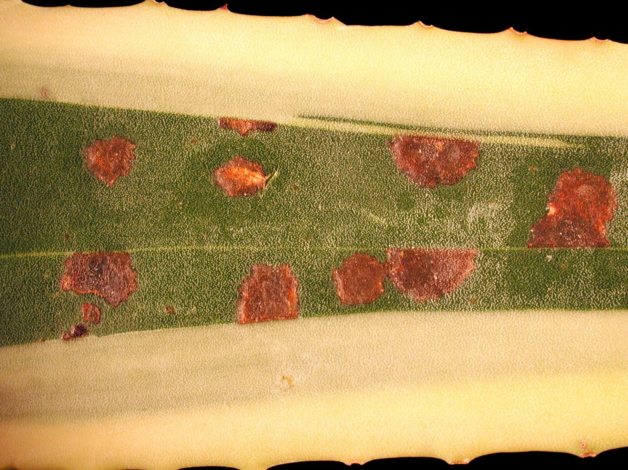 Légende: Protubérances liégeuses brunes sur feuille d’agave d’Amérique
