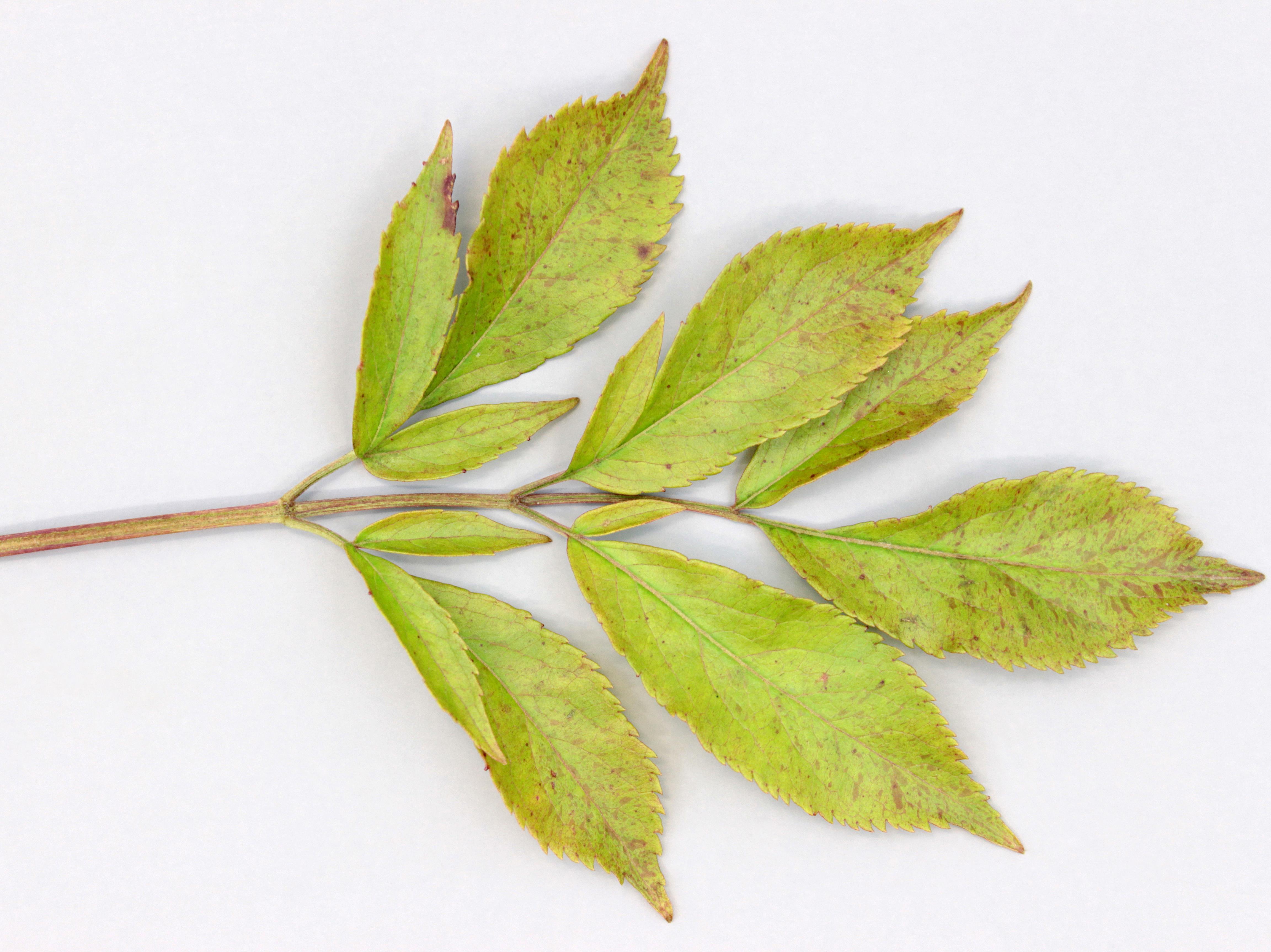 Description: Une feuille de sureau montre une fine moucheture rougeâtre à la face supérieure de tous les niveaux de feuille. Les feuilles prennent une teinte vert pâle à jaune. Ces lésions ne causent pas de dépression à la surface du limbe. Des feuilles localisées plus bas sur les rameaux ne montraient pas de symptôme (non visible ici). Les tests de laboratoire se sont avérés négatifs pour la détection de virus et de phytoplasme. Les dommages s’apparentent à l’action photo oxydante d’un polluant de l’air comme l’ozone.