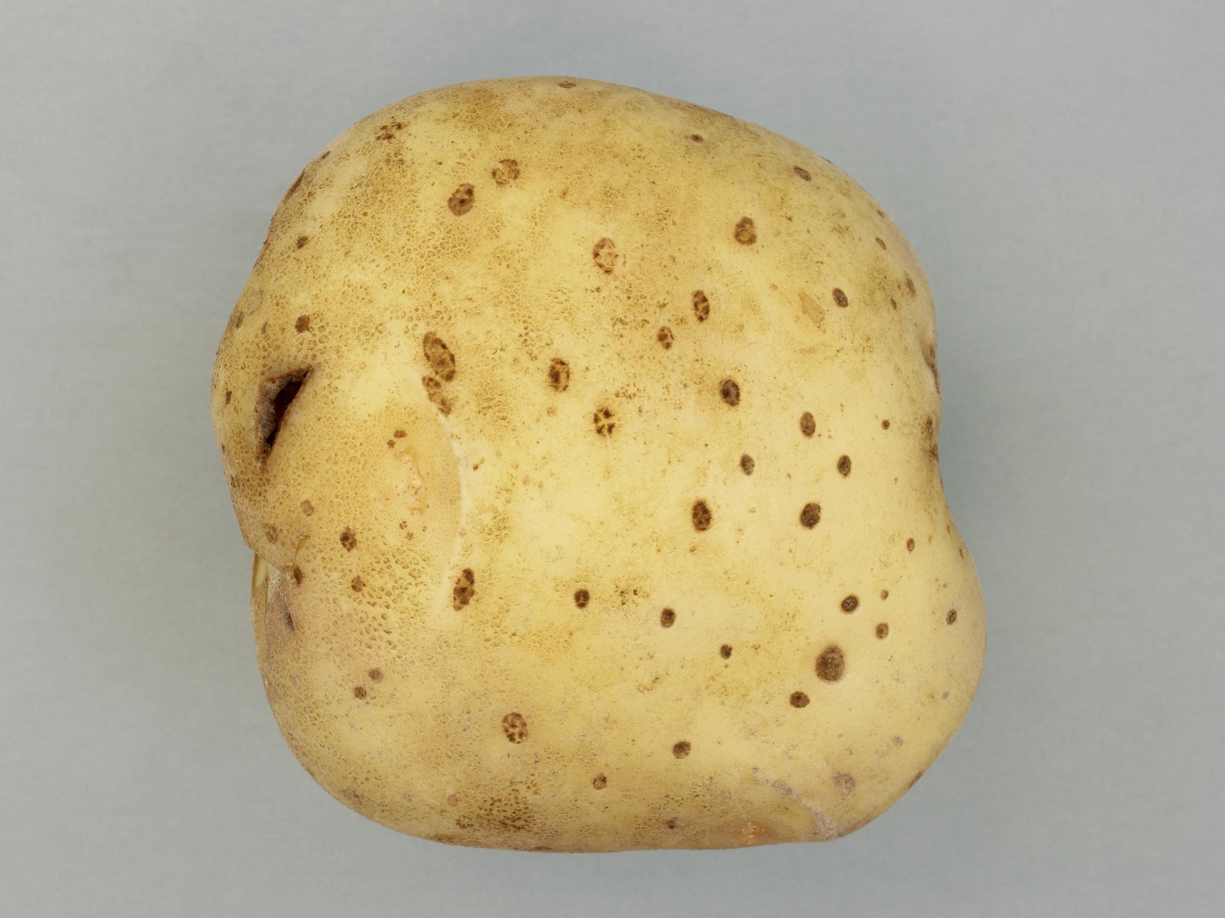 Description: Un tubercule de pomme de terre (cv 'Yukon Gold') provenant d’un champ montre un gonflement brunâtre des lenticelles. Les lenticelles affectées sont distribuées aléatoirement sur la pelure Ce symptôme est caractéristique d’un manque d’oxygène causé par un excès d’eau ou une humidité trop élevée et cause une hypertrophie des lenticelles chez la pomme de terre. Les tubercules affectés étaient situés en bordure du champ et dans des baissières.