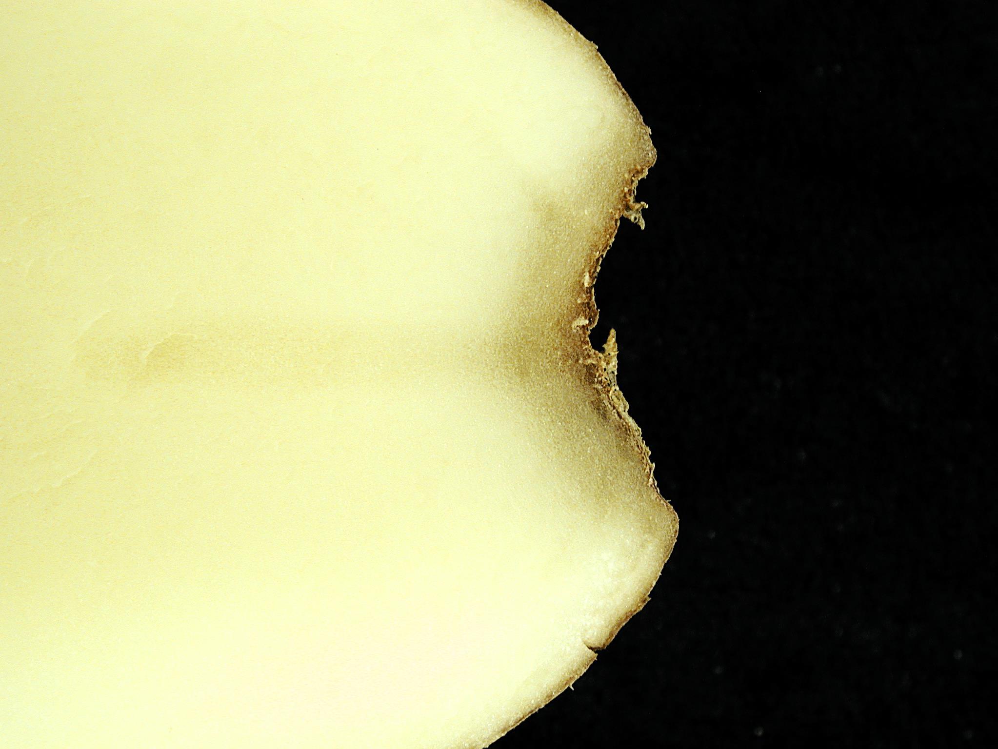 Description: Ce tubercule de pomme de terre (cv 'Eramosa') provenant d’un entrepôt montre une chair intacte sauf au niveau du talon où elle apparait vitreuse. La chair affectée est située sous une dépression située au talon. Dans cette zone, il y avait une nécrose noirâtre et superficielle. Aucun champignon ni virus n’a été détecté des dommages. Ces symptômes sont liés à un défanage chimique trop rapide qui a causé le brunissement.