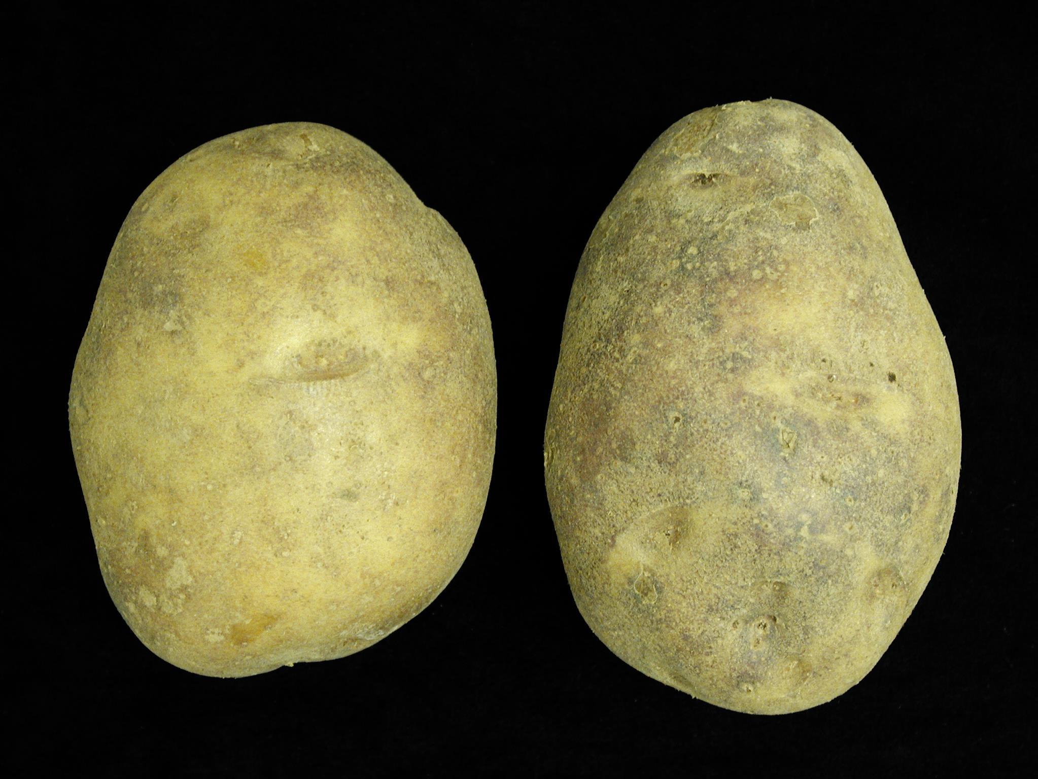 Description: Comparaison entre un tubercule de pomme de terre sain et un tubercule avec une coloration vert foncé du périderme. La chair est saine. Les tubercules proviennent d’un entrepôt. Ce symptôme est caractéristique du verdissement chez la pomme de terre.
