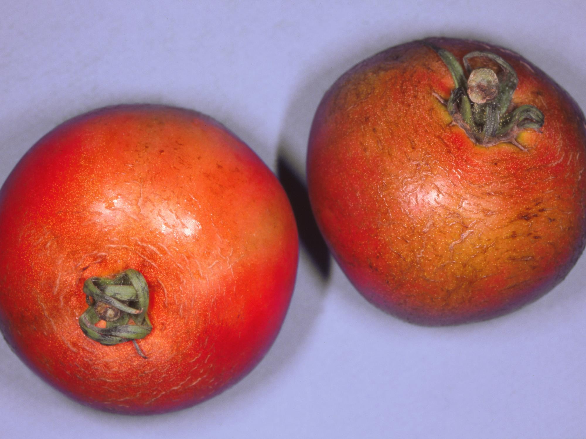 Description: Deux tomates rouges de serre montrent de nombreux petits fendillements alignés les uns au côté des autres et ils sont distribués en zone concentrique à partir de la zone pédonculaire. Ces symptômes sont caractéristiques du microfendillement ("russeting").