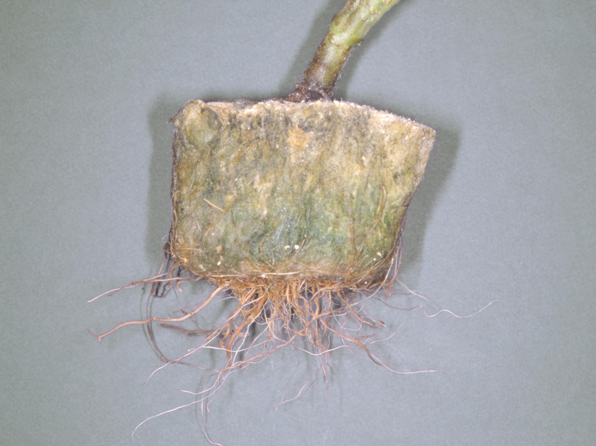 Description: Le système racinaire d’un plant de tomate de serre montre des racines brunes dont le cortex se détache facilement de la stèle. Le système racinaire est sévèrement affecté. Le plant était flétri et les feuilles montraient une brûlure marginale. Les tests de laboratoire ont révélé une conductivité électrique très élevée (15 mS/cm) dans le substrat (laine de roche) et aucun champignon n’a été détecté des racines. Les symptômes sont la conséquence d’une salinité trop élevée, ce qui a endommagé le système racinaire. La conductivité électrique devrait se situer autour de 2,5 mS/cm.