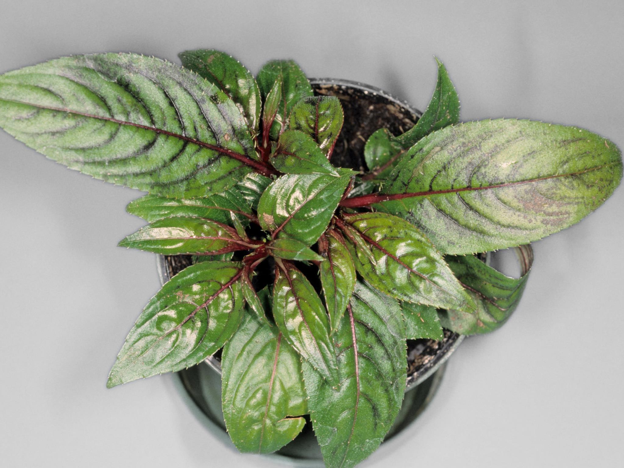 Description: Un plant d’impatiente montre des feuilles avec un noircissement des nervures et une coloration vert pâle du limbe. Quelques taches circulaires pourpres sont également visibles sur certaines feuilles. Tous les tests de laboratoire se sont avérés négatifs pour la détection de virus et de champignons. Par contre, le pH est élevé (6,8) et la conductivité électrique est faible (0,7 mS/cm)). L’impatiente de Nouvelle-Guinée demande un pH se situant entre 6,0 et 6,6 tandis que la conductivité électrique doit se situer entre 2,0 et 3,5 mS/cm.