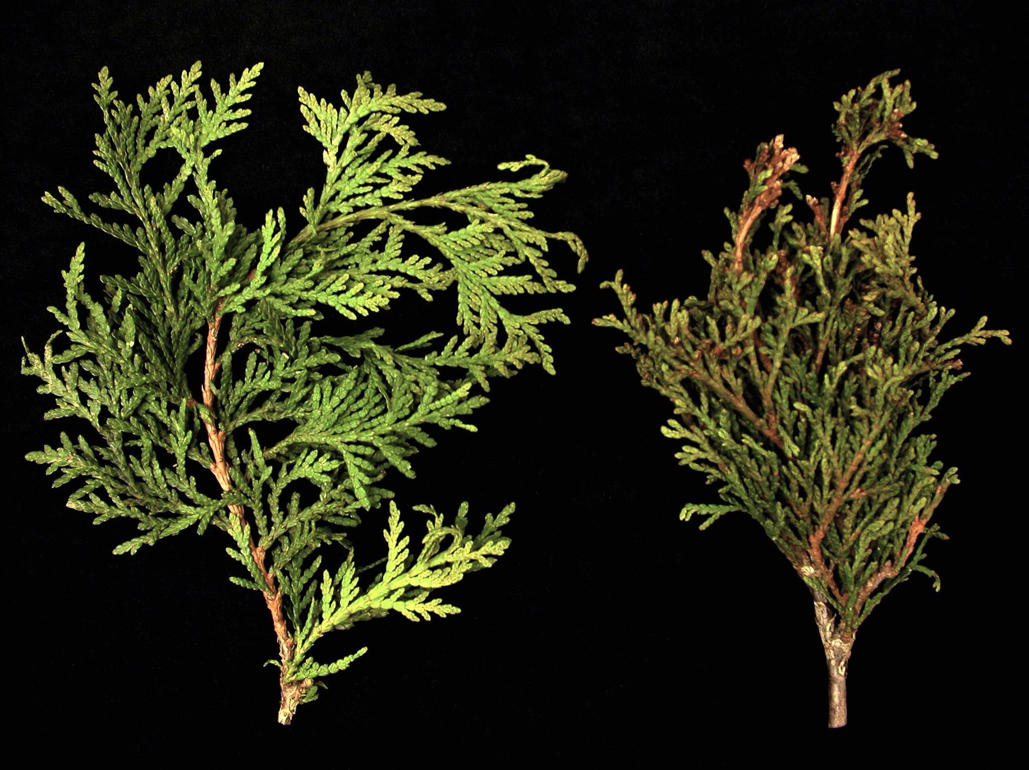 Légende: Comparaison entre une pousse terminale de thuya saine et affectée