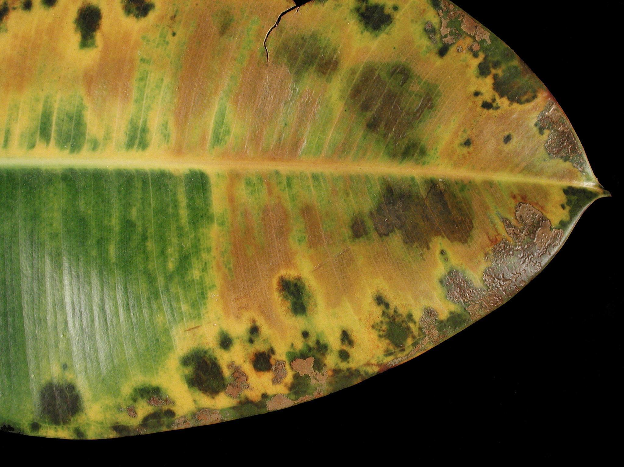 Légende: Taches brunes et jaunissement sur feuille de caoutchouc des jardins